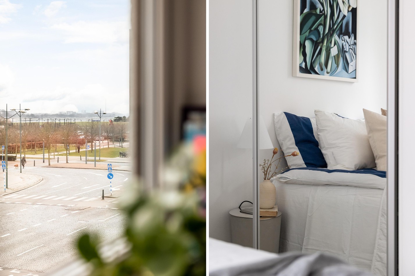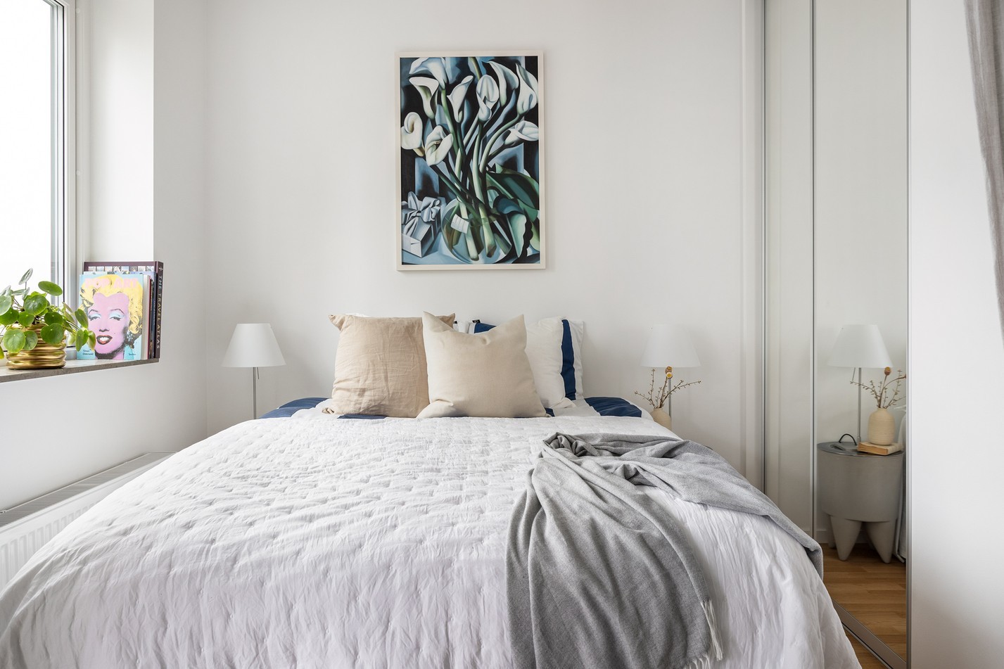 Ett stilrent och harmoniskt sovrum med ljusa ytor och smart planering. Stora fönster och balkongdörr släpper in rikligt med dagsljus och skapar en luftig känsla. Den platsbyggda garderobsväggen med spegelskjutdörrar ger generös förvaring samtidigt som rummet behåller sin öppna och inbjudande atmosfär. Här får du en lugn och avkopplande plats att vakna upp till varje morgon.