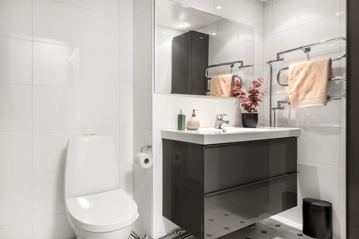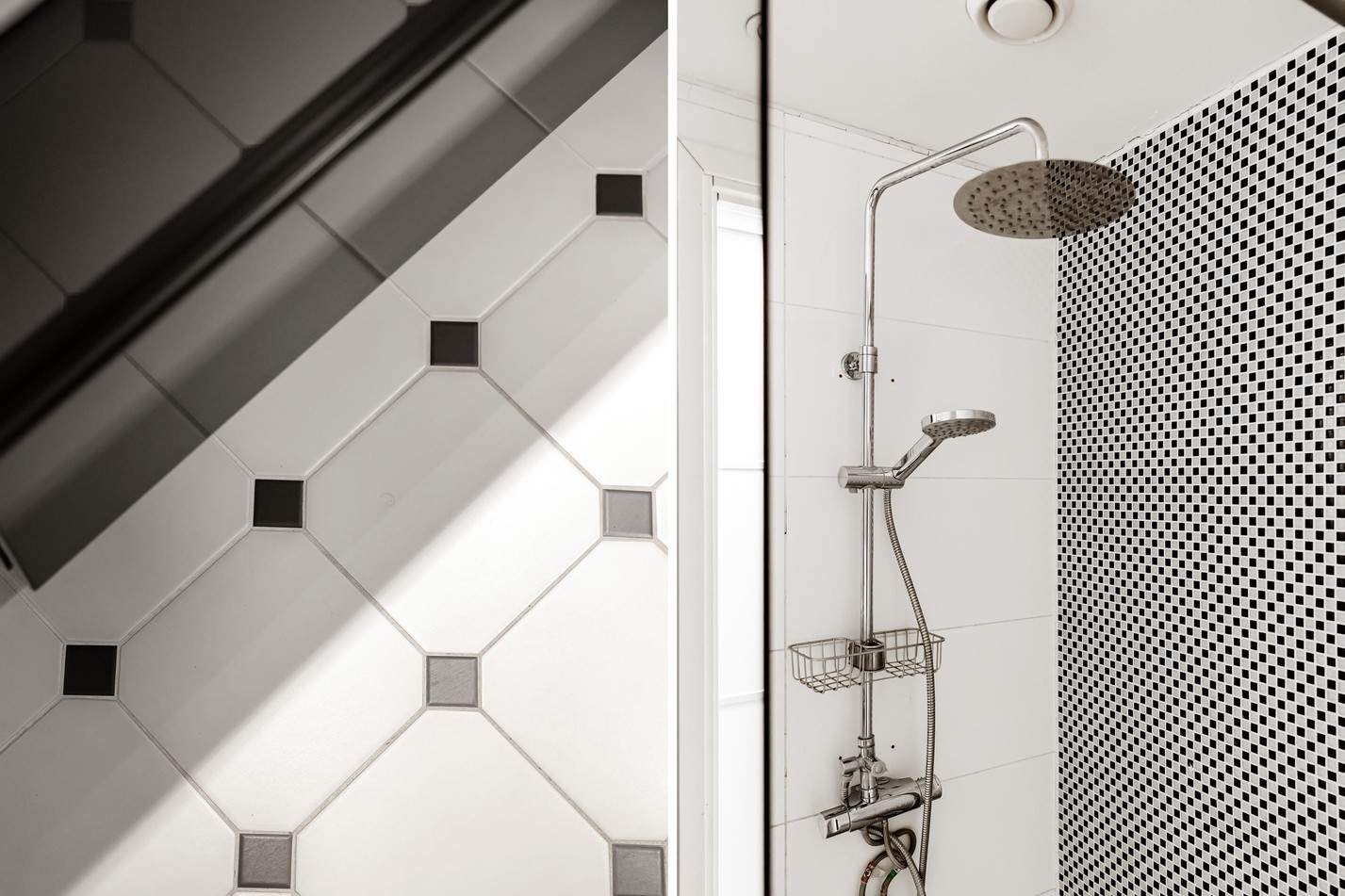 Ett elegant och modernt badrum med stilren design och högkvalitativa materialval. De stora, ljusa kakelplattorna ger en fräsch och rymlig känsla, medan den smakfulla mosaiken i duschdelen skapar en exklusiv touch. Den rymliga kommoden med spegelskåp erbjuder praktisk förvaring, och den uppvärmda handdukstorken höjer komforten. Ett badrum där funktionalitet möter lyx för en avkopplande vardag!