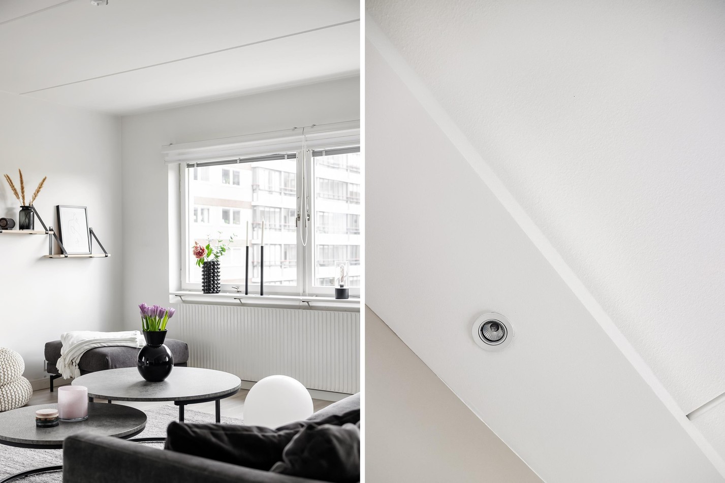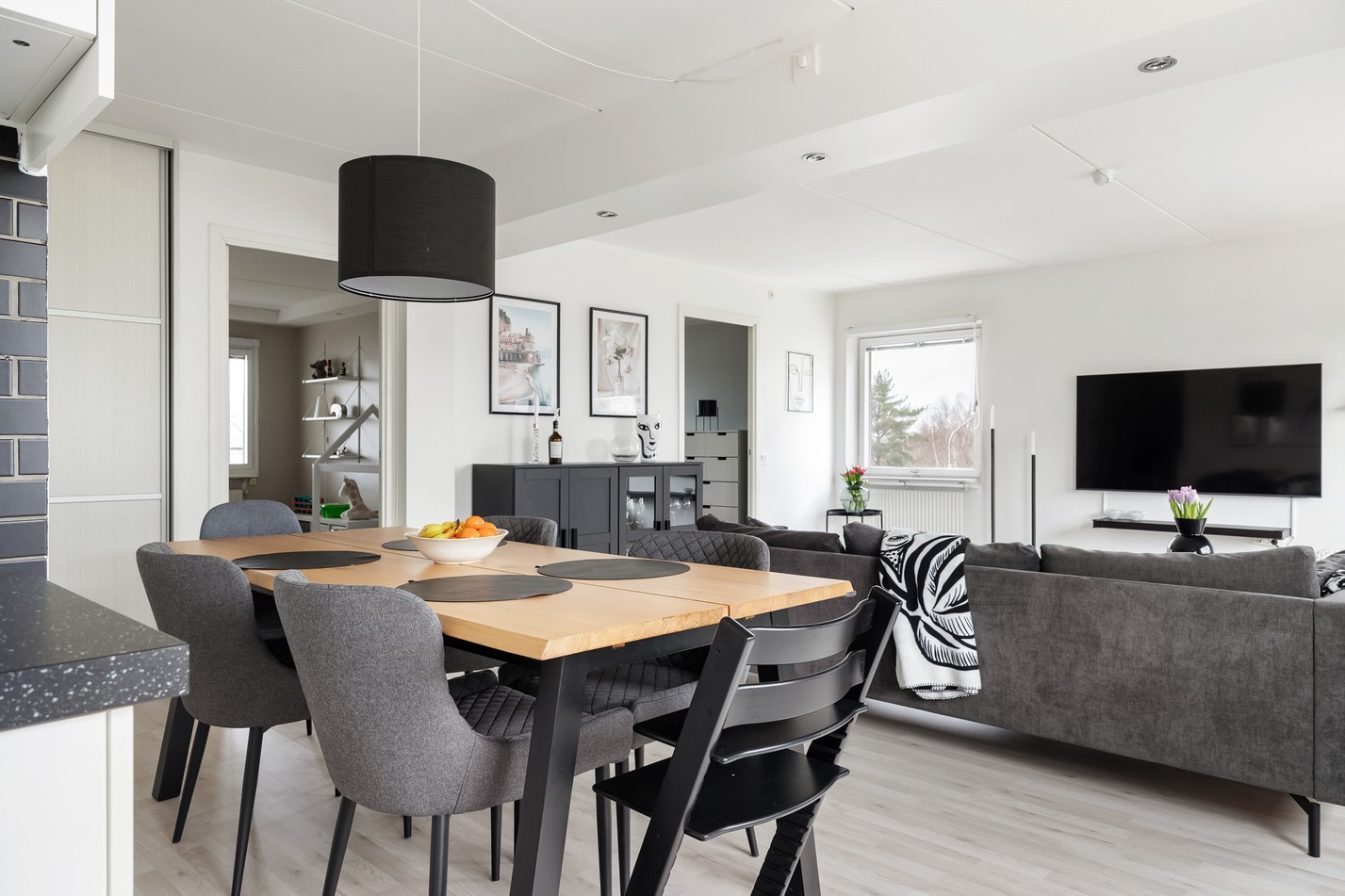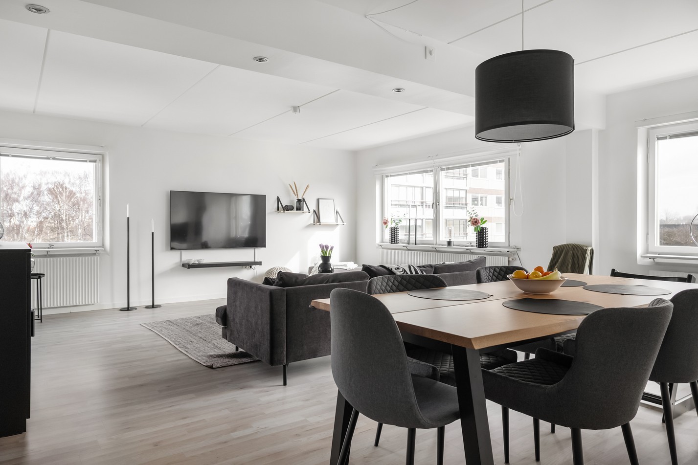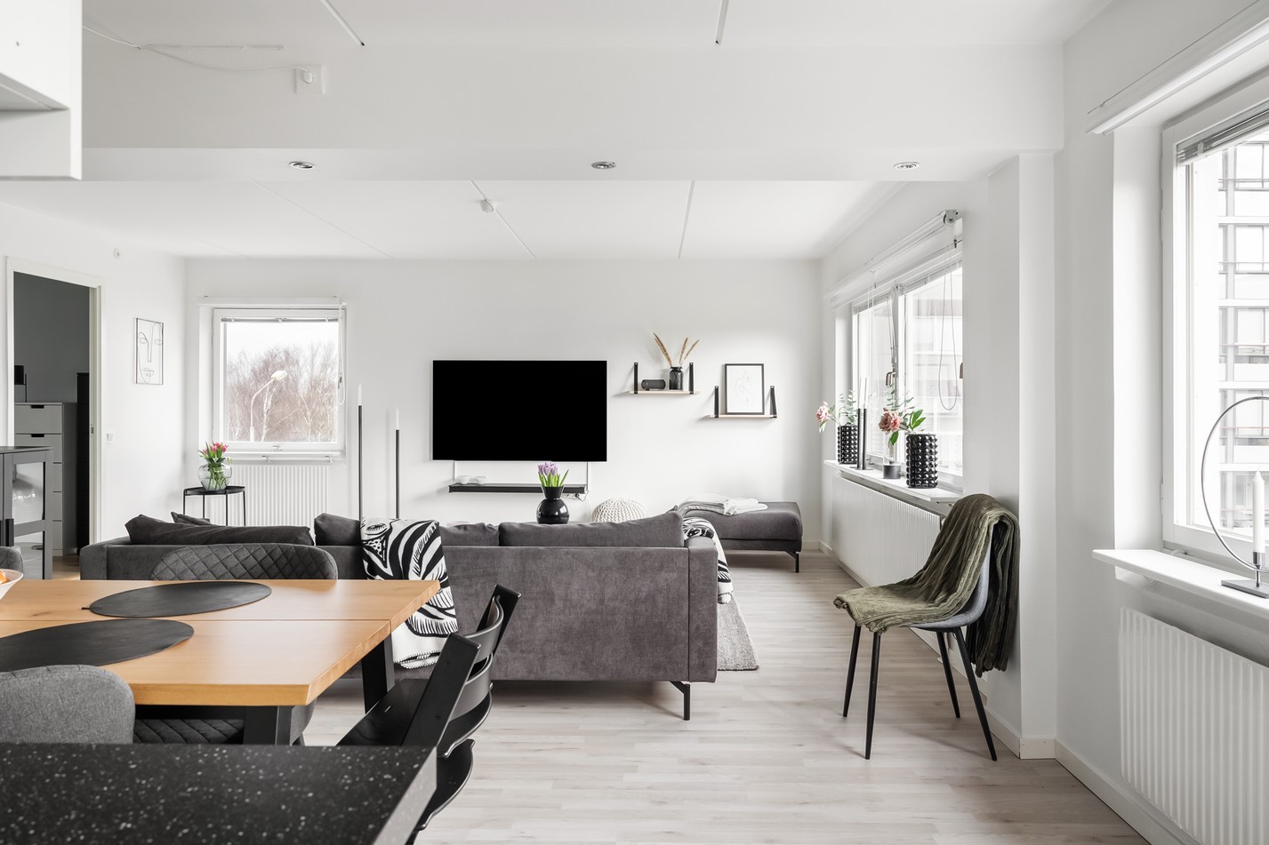 Detta ljusa och stilfulla vardagsrum bjuder på en modern och inbjudande atmosfär där naturligt ljus flödar in genom stora fönster. Den öppna planlösningen mot köket skapar en social och rymlig känsla, perfekt för både vardagsmys och festliga tillställningar. Med sina ljusa väggar, stilrena möbler och smakfulla detaljer är detta ett rum att trivas i. Här kombineras komfort och elegans på bästa sätt!