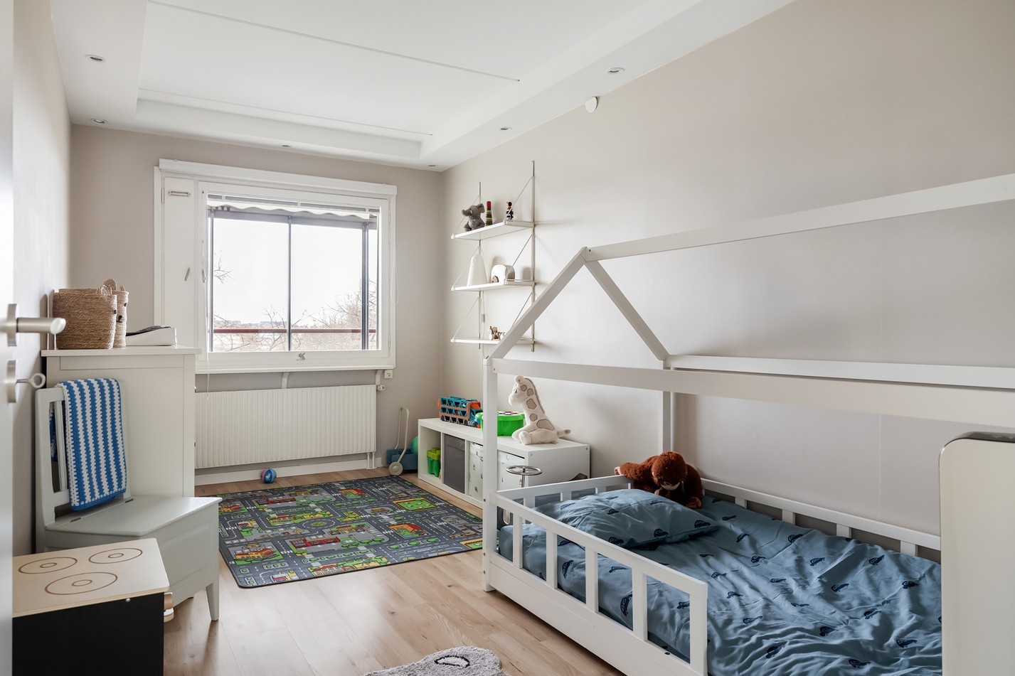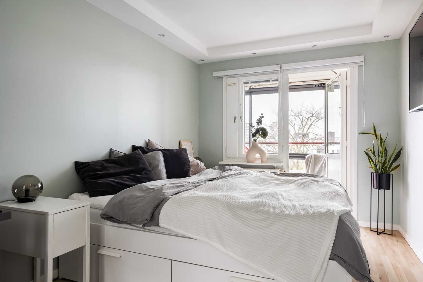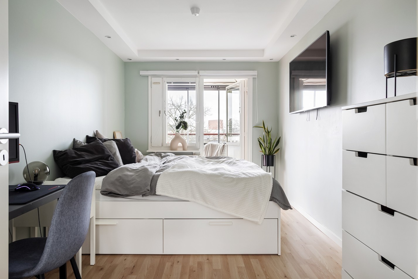 Ett stilrent och harmoniskt sovrum där ljuset flödar in genom det stora fönstret, som även bjuder på en härlig utsikt. Den generösa ytan rymmer en stor säng och praktisk förvaring, samtidigt som de ljusa tonerna skapar en lugn och avslappnande atmosfär. Perfekt för en god natts sömn och en rofylld start på dagen!