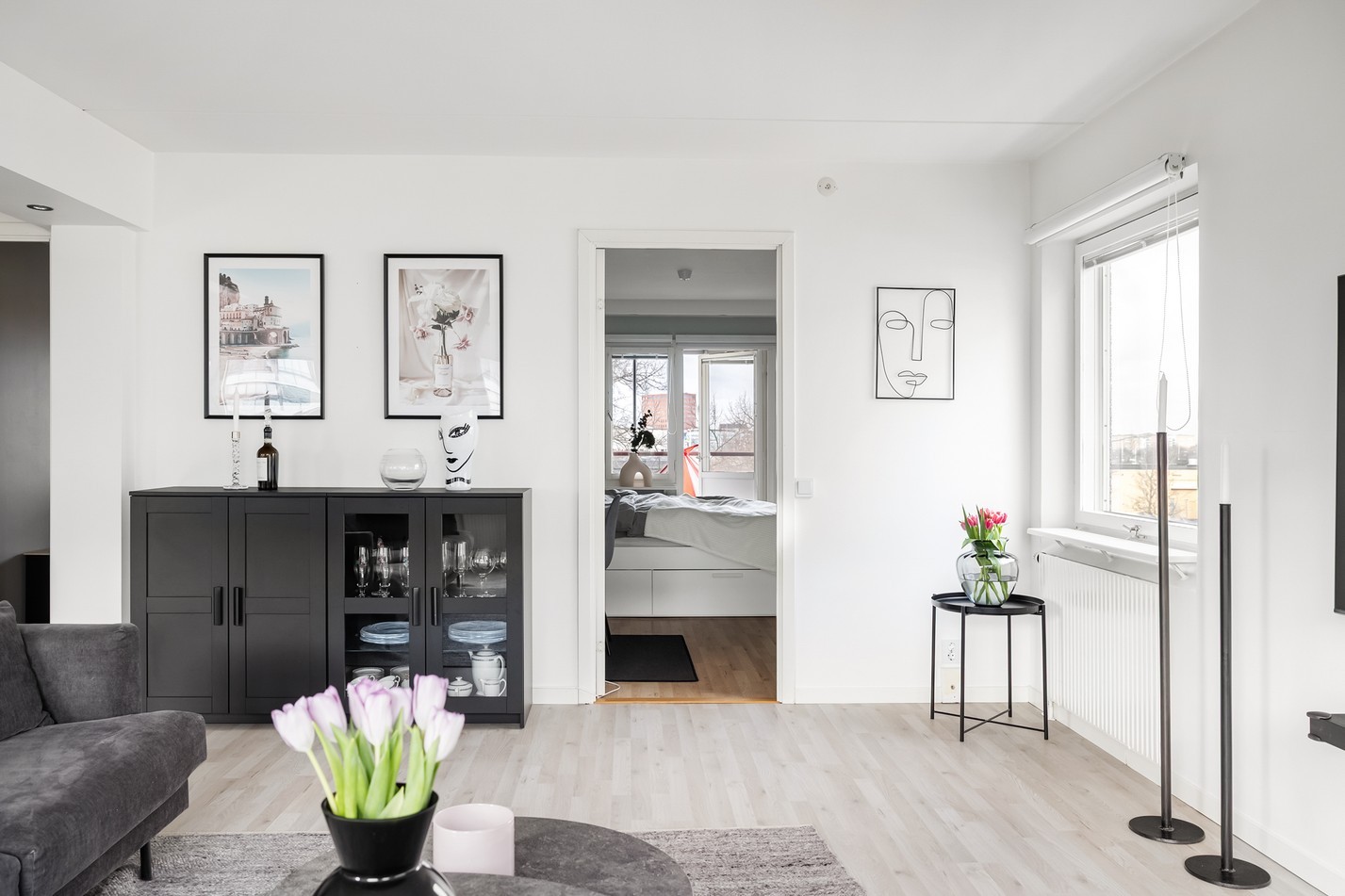 Ett harmoniskt och rymligt sovrum med ljusa ytor och en lugn atmosfär. De stora fönstren och balkongdörren släpper in ett härligt ljusinsläpp och skapar en luftig känsla. Härifrån har du direkt access till den inglasade balkongen, vilket ger en extra dimension av rymd och möjlighet att njuta av utomhusmiljön året om. Här finns gott om plats för både säng och förvaring, och den stilrena inredningen skapar en avslappnande och trivsam miljö. En perfekt plats för återhämtning och vila!