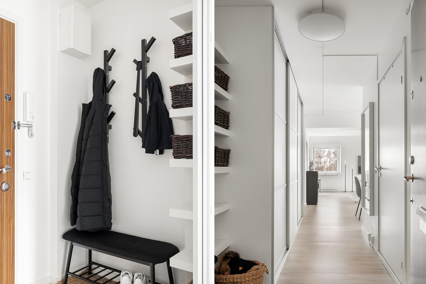 En ljus och rymlig hall som ger ett inbjudande första intryck. De stilrena skjutdörrsgarderoberna erbjuder generös förvaring och håller ordning på ytterkläder och skor. Det genomtänkta ljusinsläppet från bostadens öppna planlösning skapar en luftig och harmonisk känsla. Här möts stil och funktion – en perfekt entré till ditt hem!