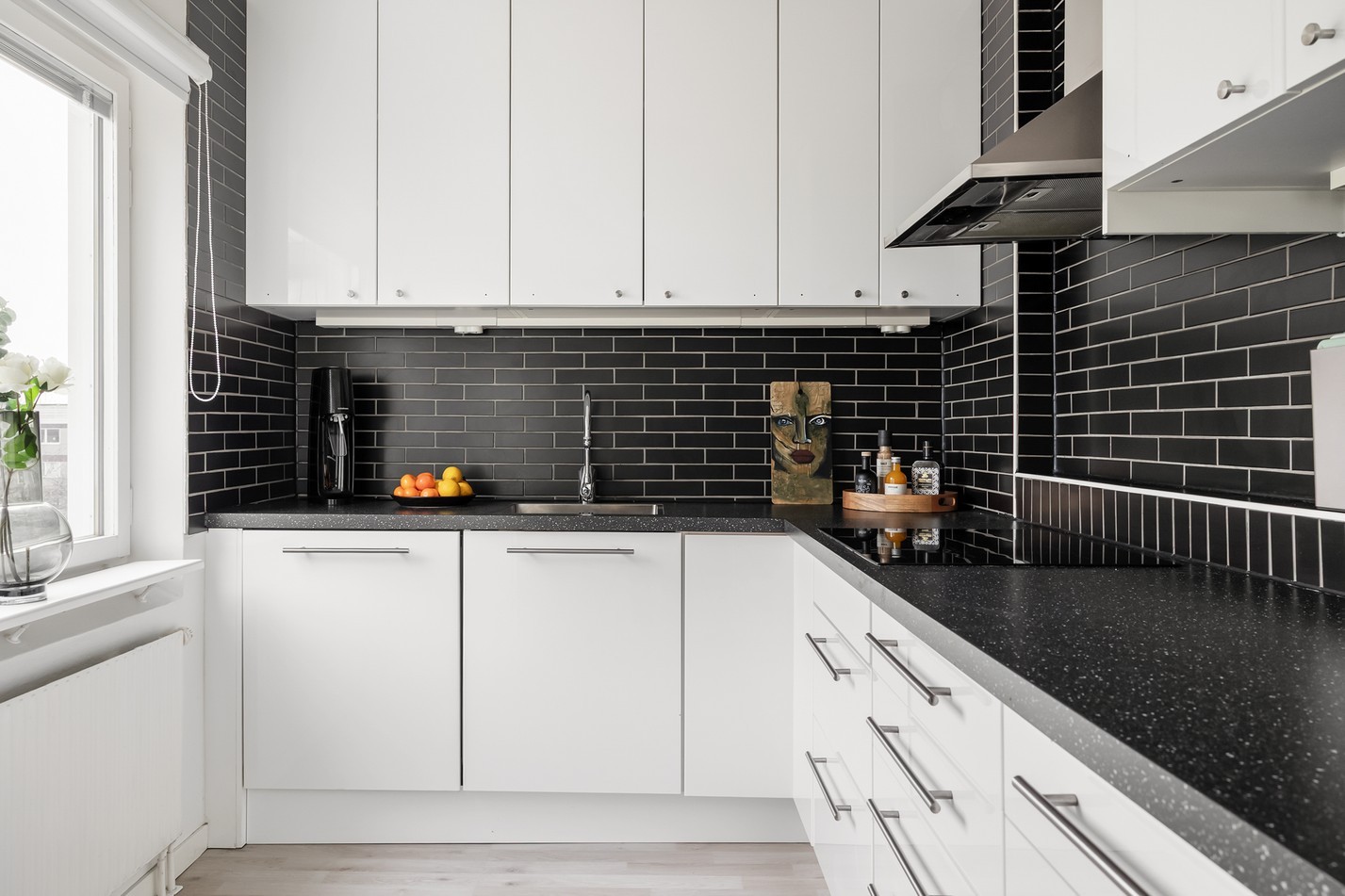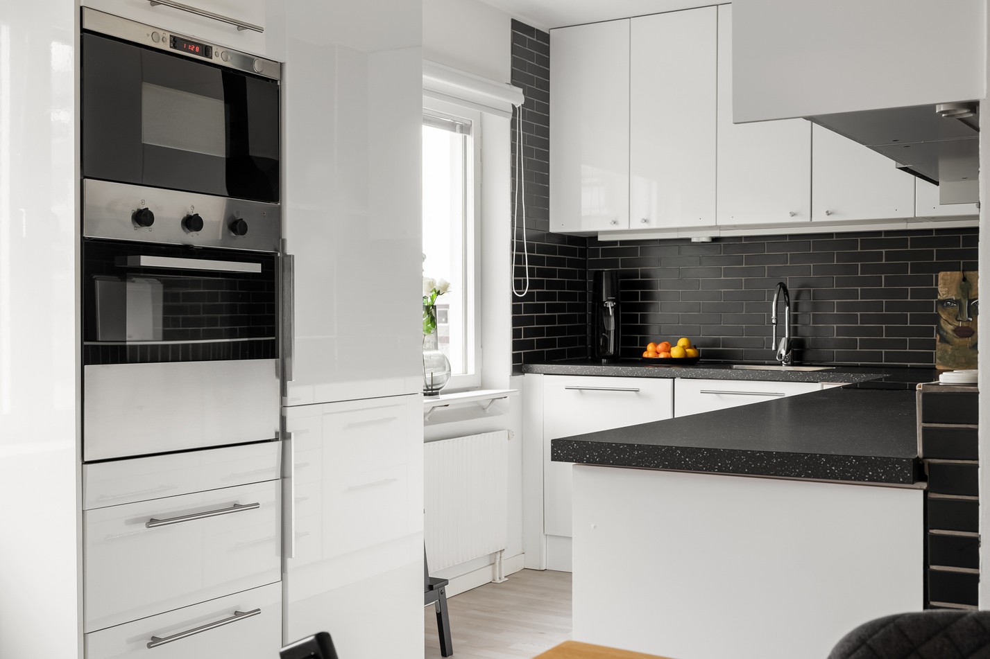 Detta eleganta kök kombinerar modern design med smart funktionalitet. Vita, högblanka skåp möter mörka bänkskivor och stilfullt kakel för en tidlös look. Här finns gott om arbetsyta, generös förvaring och integrerade vitvaror som gör matlagningen både smidig och inspirerande. Ett kök att trivas i – perfekt för både vardagsmiddagar och festliga stunder!