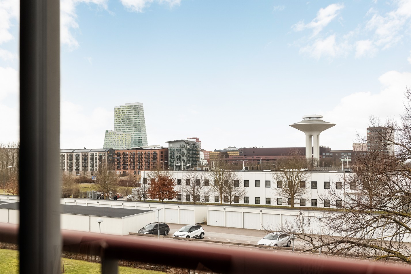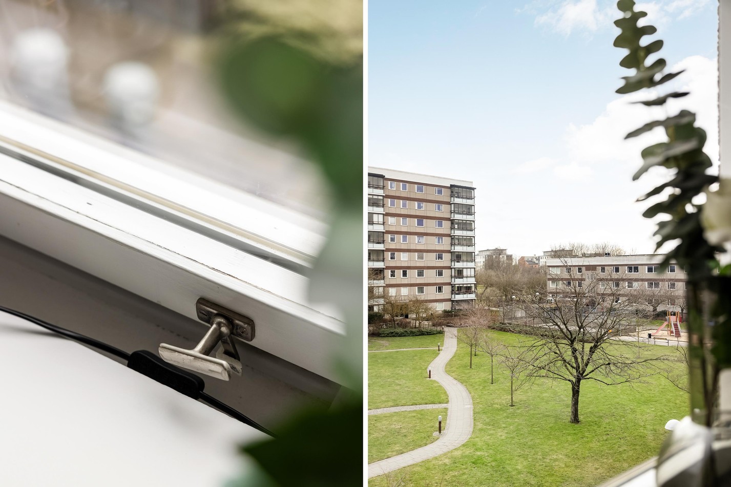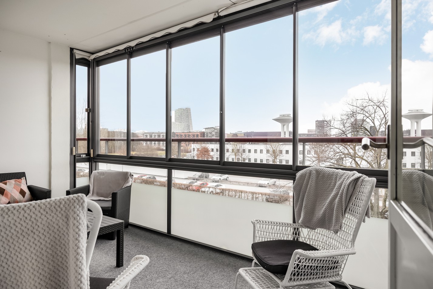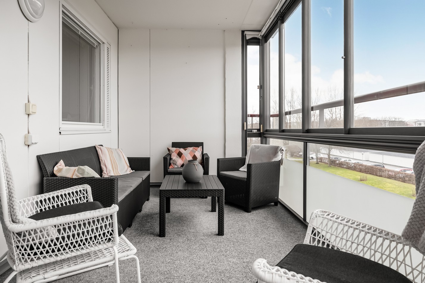 Här njuter du av en rymlig, inglasad balkong med fantastisk utsikt över grönska. De stora fönsterpartierna släpper in rikligt med ljus och skapar en luftig och harmonisk känsla. Tack vare inglasningen kan balkongen användas året om, perfekt för avkoppling med en kopp kaffe eller mysiga kvällar. Ett extra rum att trivas i – oavsett säsong!
