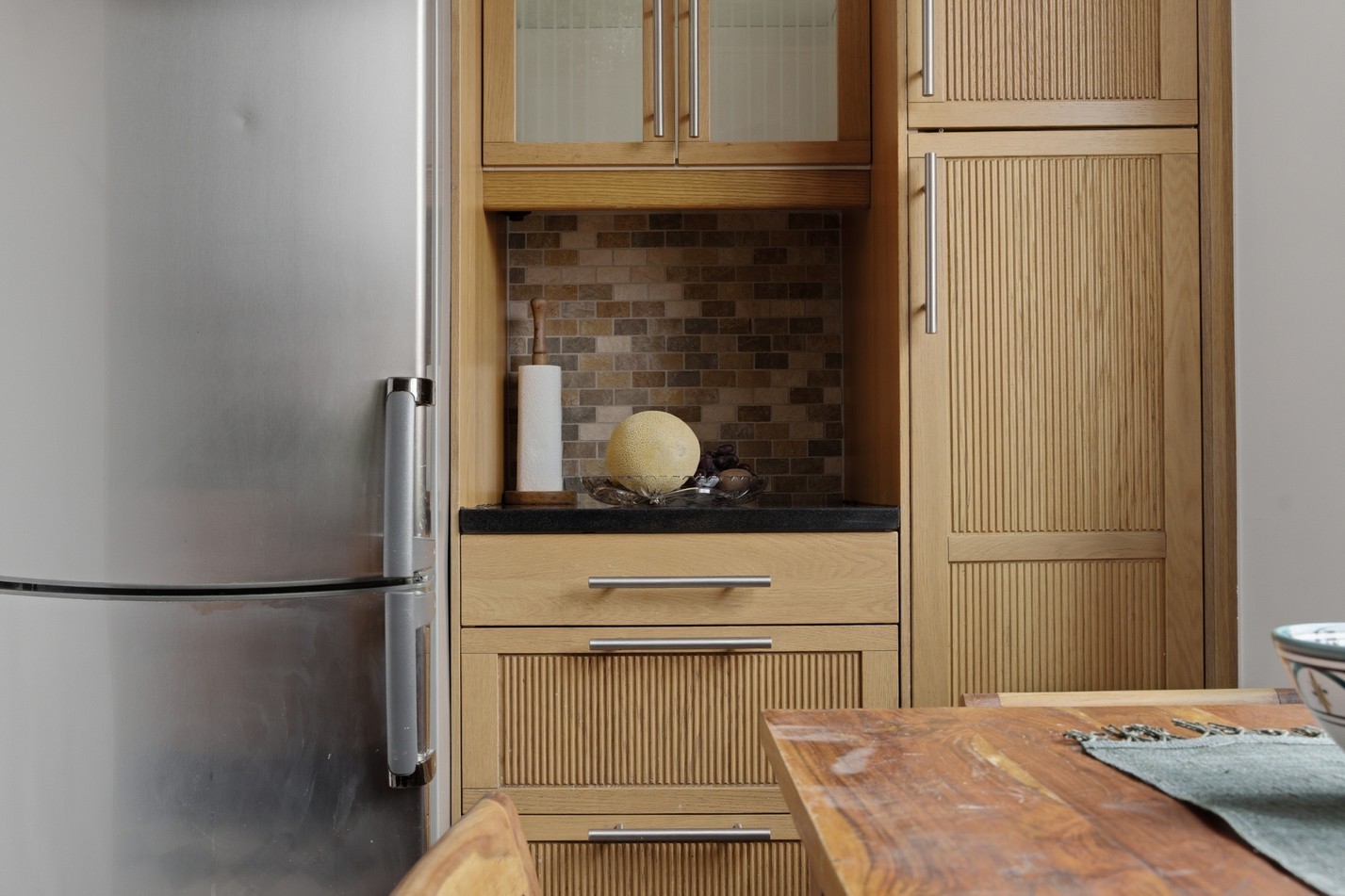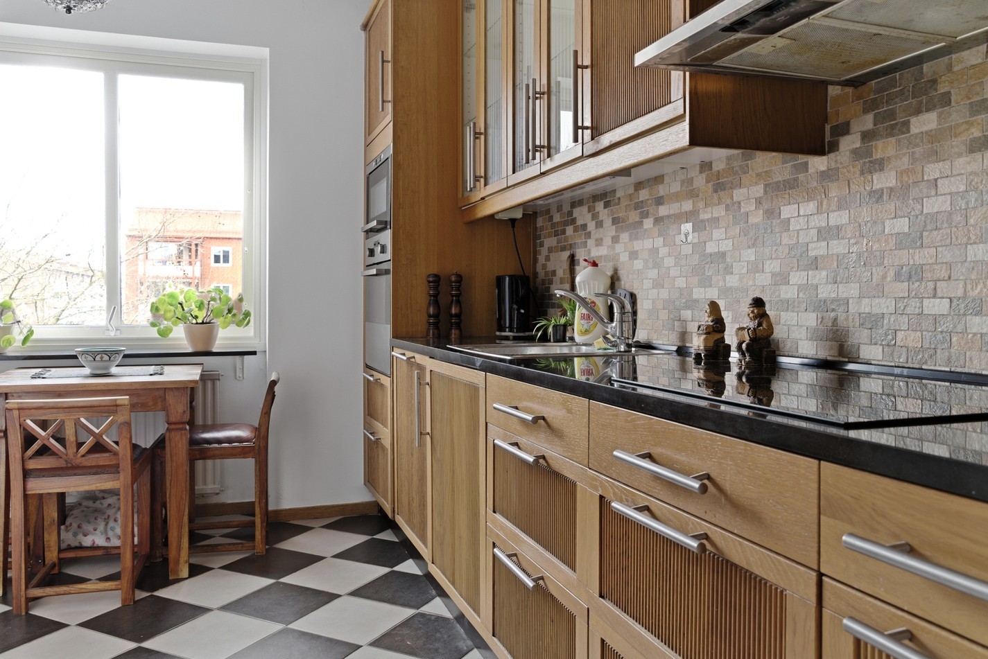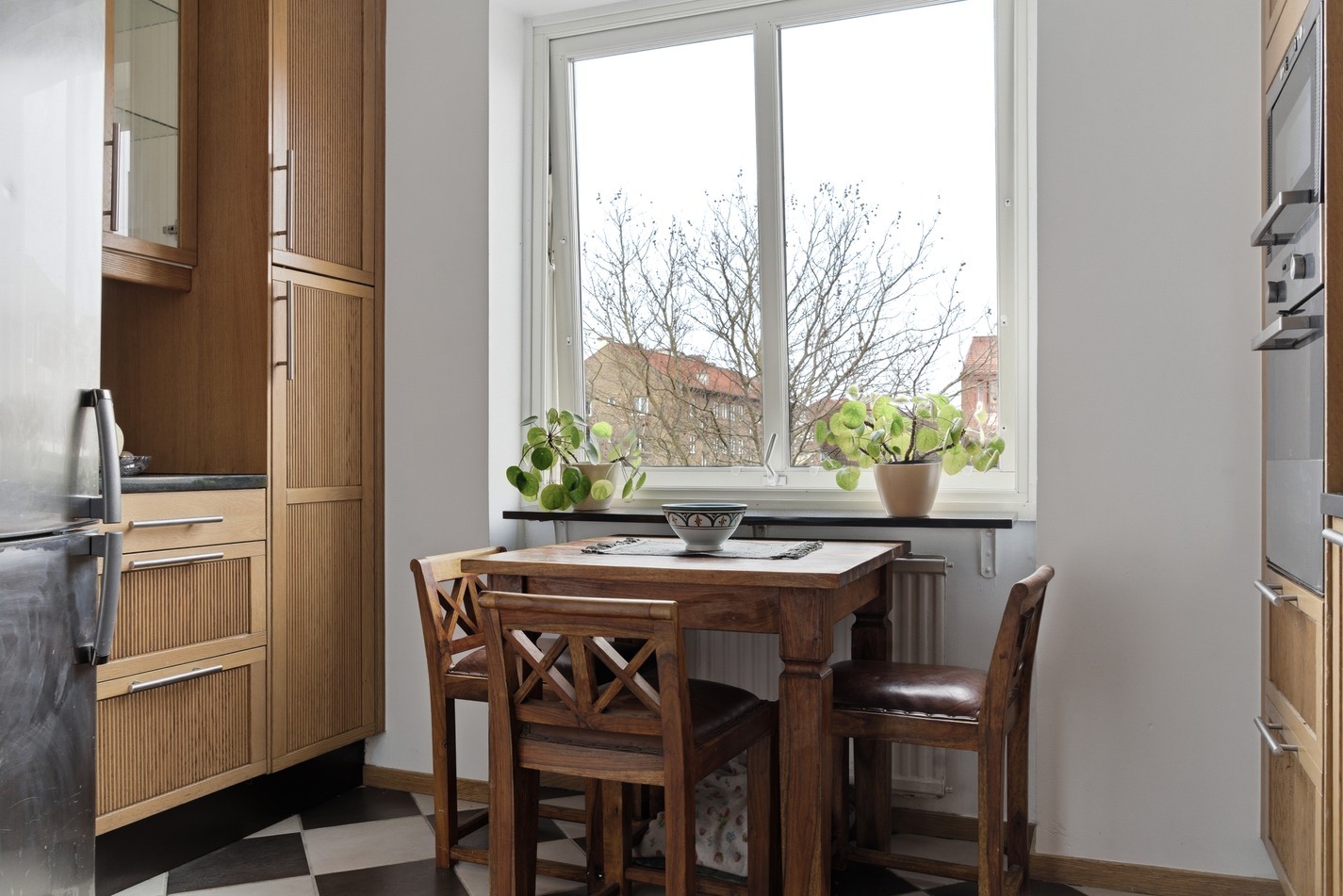 Trivsamt kök med varm träinredning och goda arbetsytor. Här finns plats för en mindre matgrupp vid fönstret som bjuder på fint ljusinsläpp och utsikt. Ett funktionellt och hemtrevligt kök med gott om förvaring.