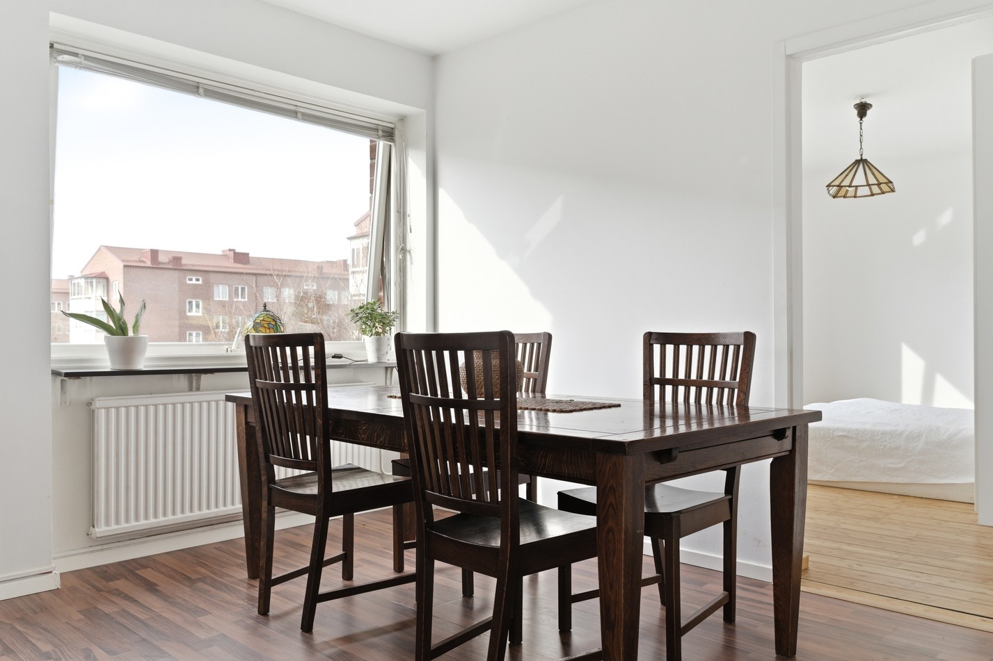Ljust och inbjudande vardagsrum med fint ljusinsläpp från stora fönster och utgång till inglasad balkong. Rummet erbjuder generösa ytor för både soffgrupp och matplats, vilket skapar en social och trivsam miljö. Den inglasade balkongen blir en naturlig förlängning av rummet och ger extra utrymme att njuta av året om.