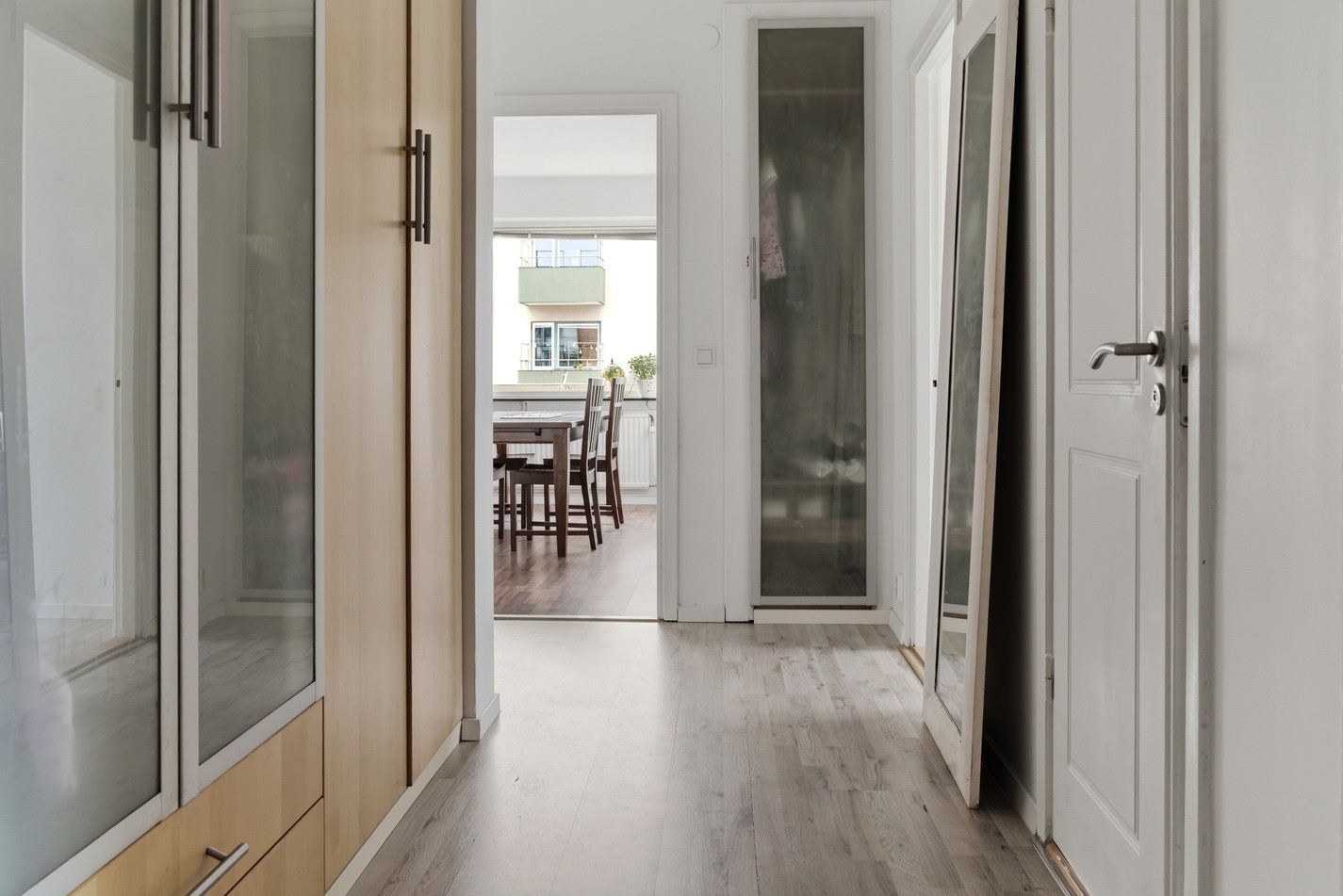 Välkomnande hall med gott om förvaring i flera garderober. Ljusa ytskikt och genomgående golv skapar en enhetlig och luftig känsla redan vid första steget in i bostaden.