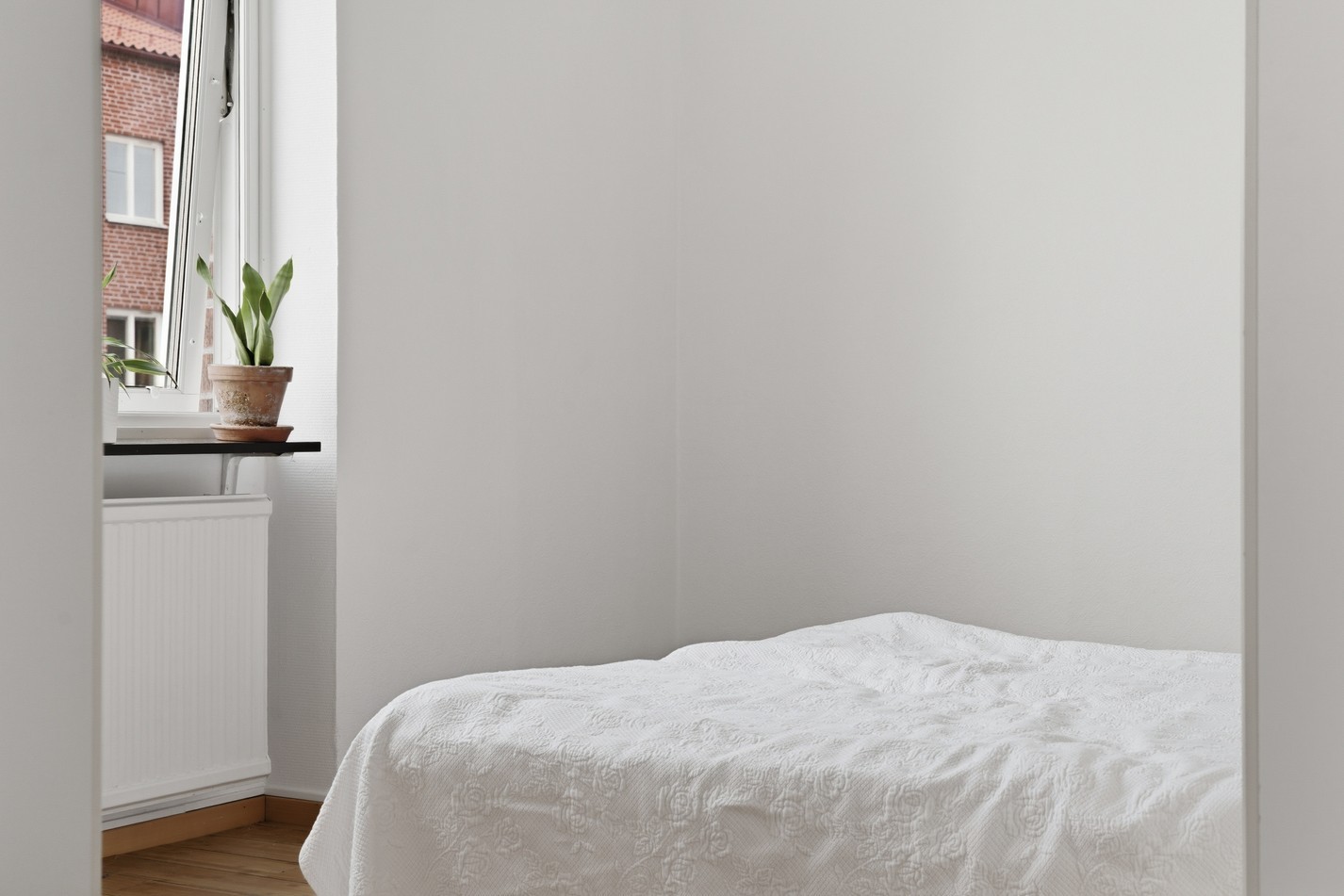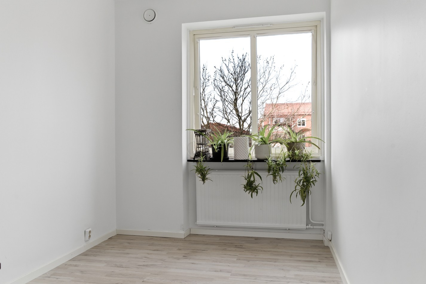 Ljust och stilrent rum som passar perfekt som sovrum eller hemmakontor. Stort fönster ger ett härligt ljusinsläpp och skapar en luftig känsla. Här finns även praktisk, inbyggd förvaring som gör det enkelt att hålla rummet organiserat och trivsamt.