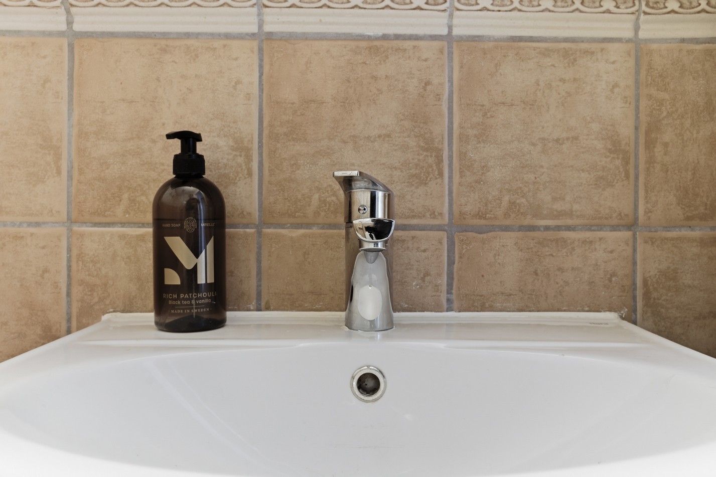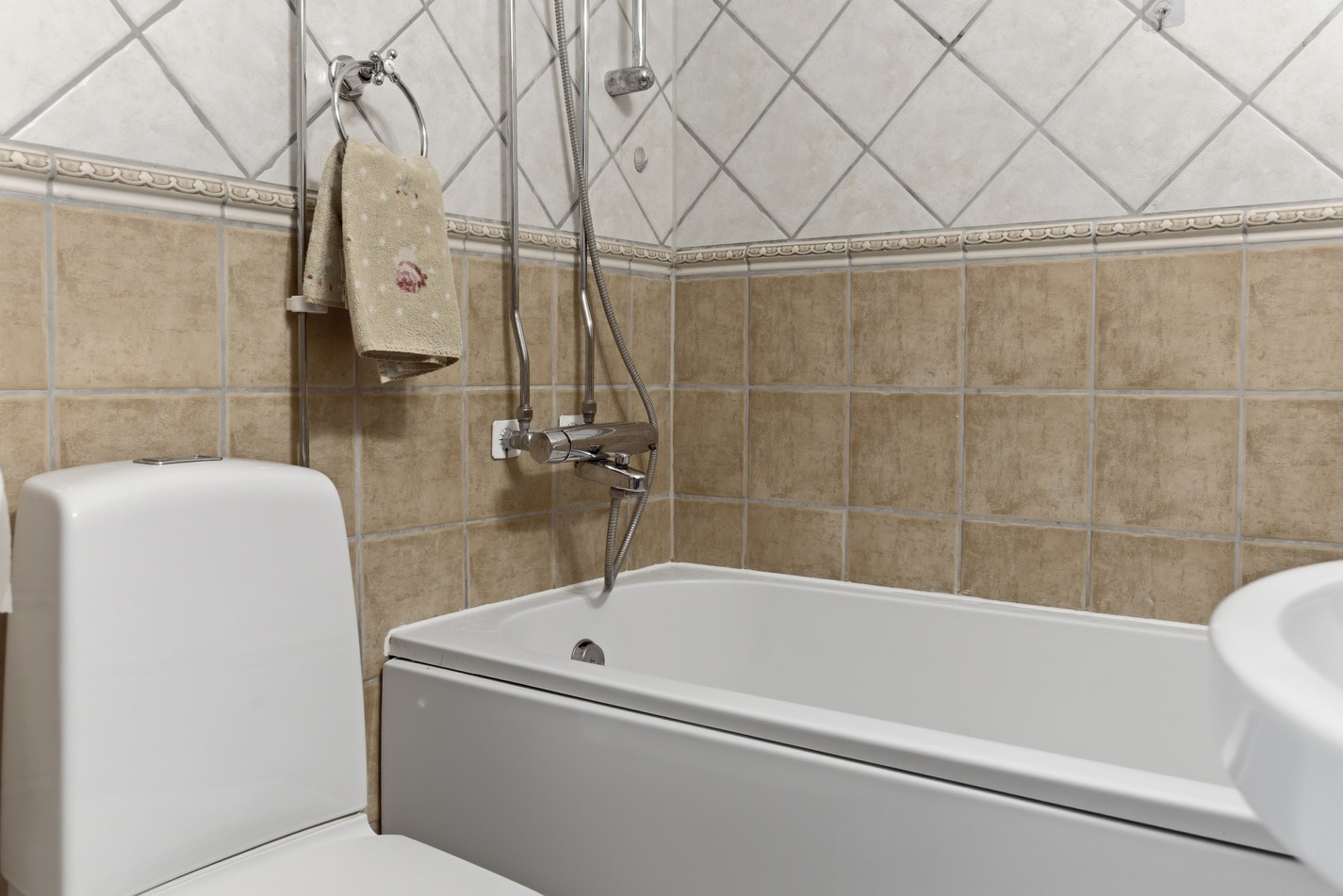 Badrum med klassiskt kakel och badkar som ger möjlighet till både avkopplande bad och snabba duschar. Praktiskt planerat med allt du behöver för en funktionell vardag.