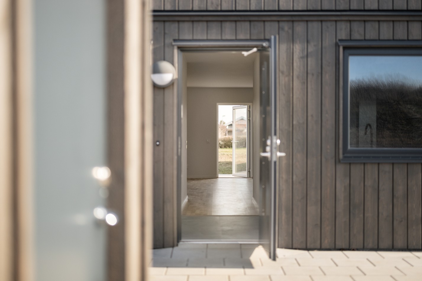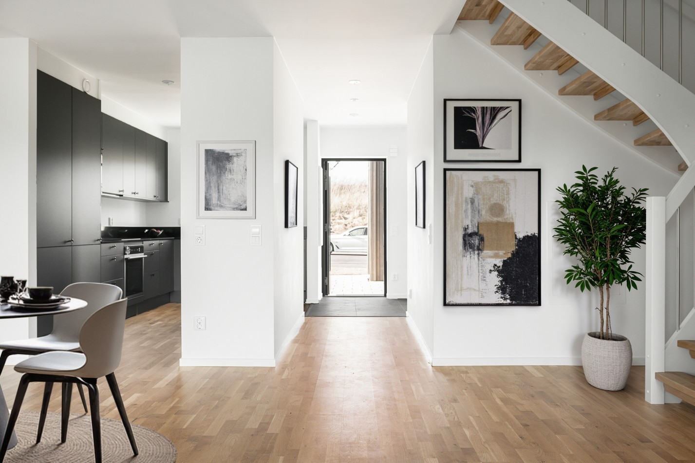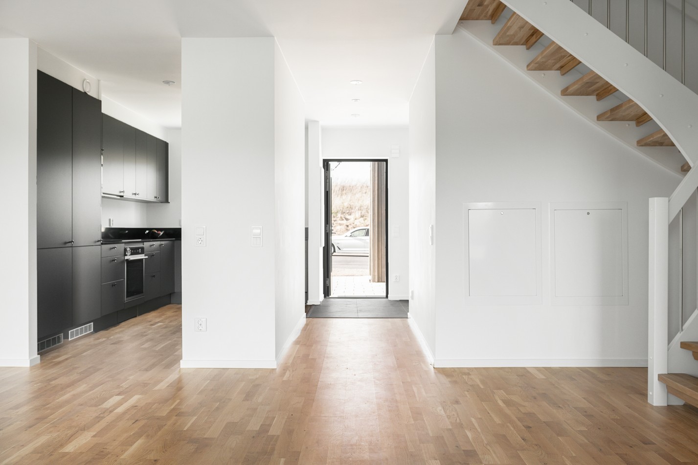 Mattlackad ekparkett och vita väggar samt utgång till uteplats. Härifrån nås ovanvåningen.