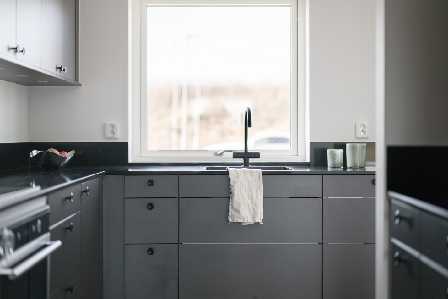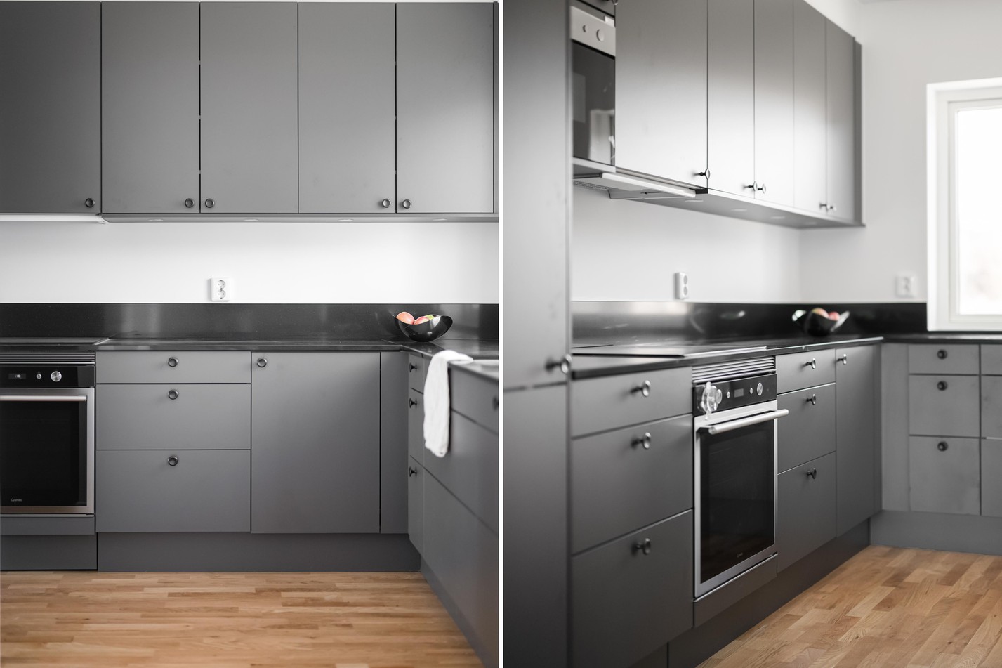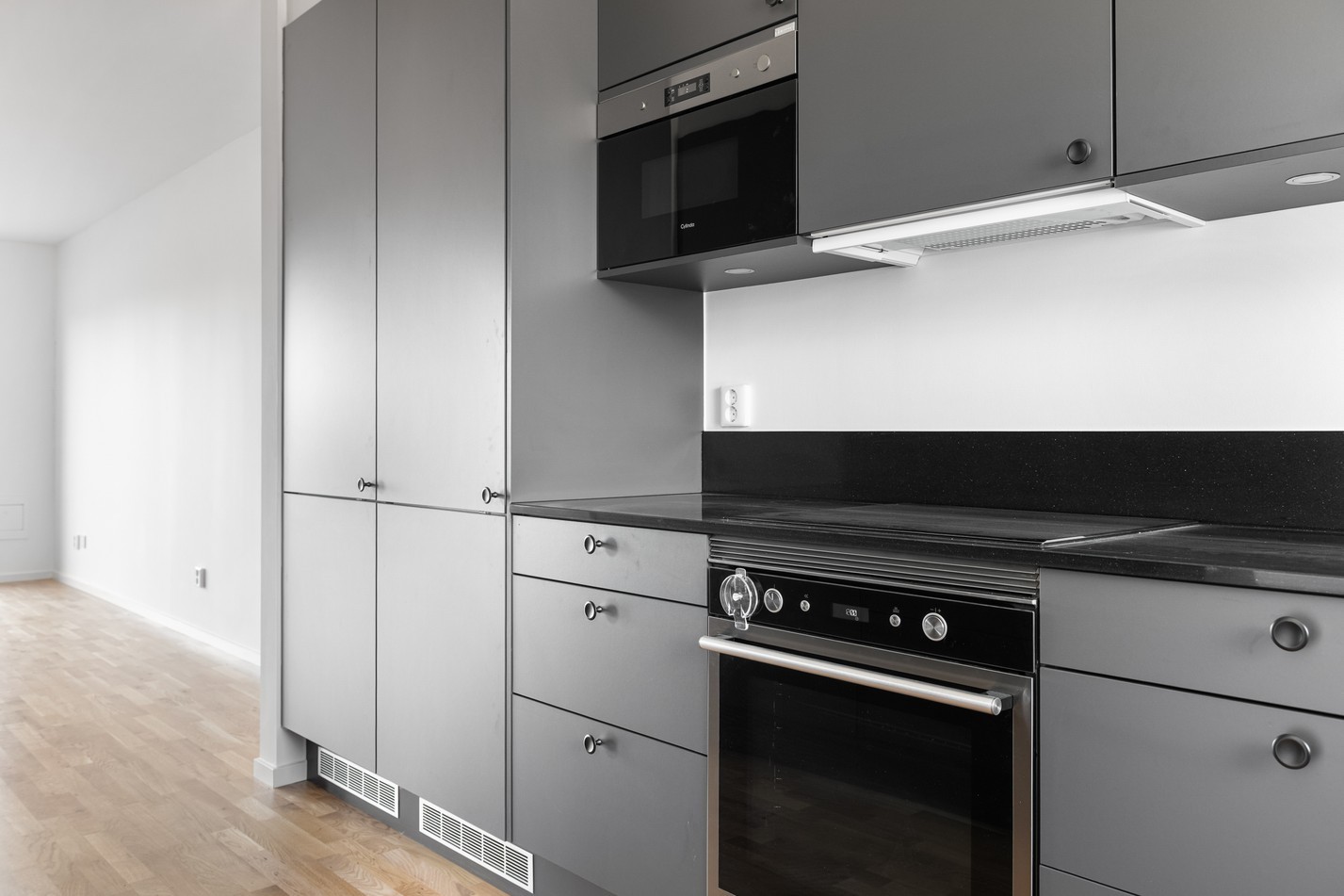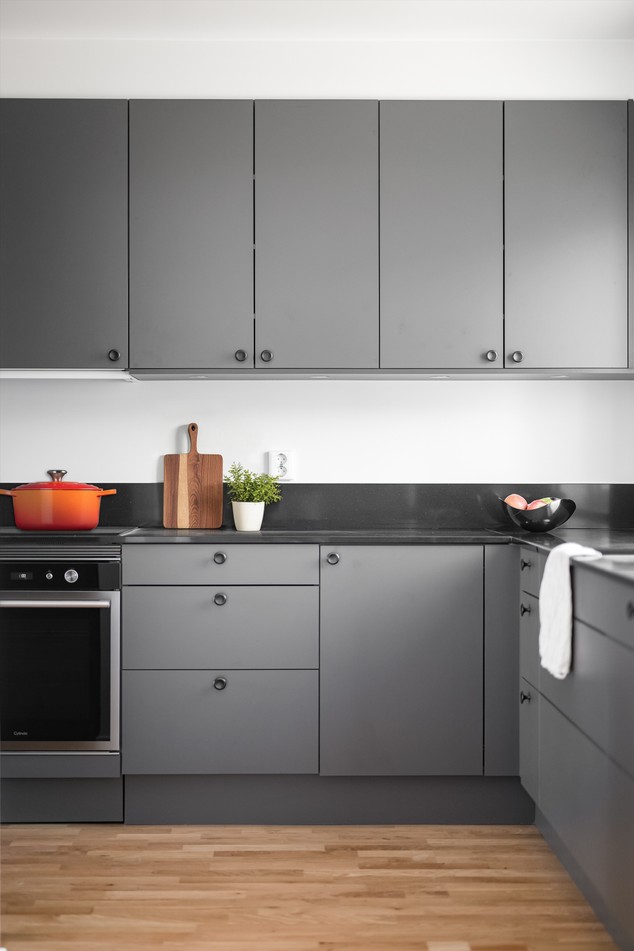 Mattlackad ekparkett och vita väggar. Grå köksinredning (Marbodal) och blankpolerad kvartskomposit som stänkskydd samt arbetsbänk. Integrerad kyl/frys, inbyggd mikrovågsugn, induktionshäll, fläkt, ugn, integrerad diskmaskin och vask med tapwellblandare. Samtliga vitvaror är från Cylinda förutom fläkten som är från Slimeline och induktionshällen Siemens.
