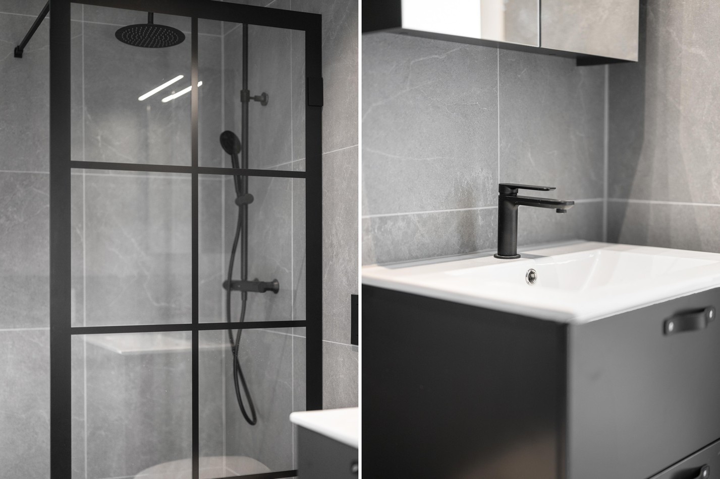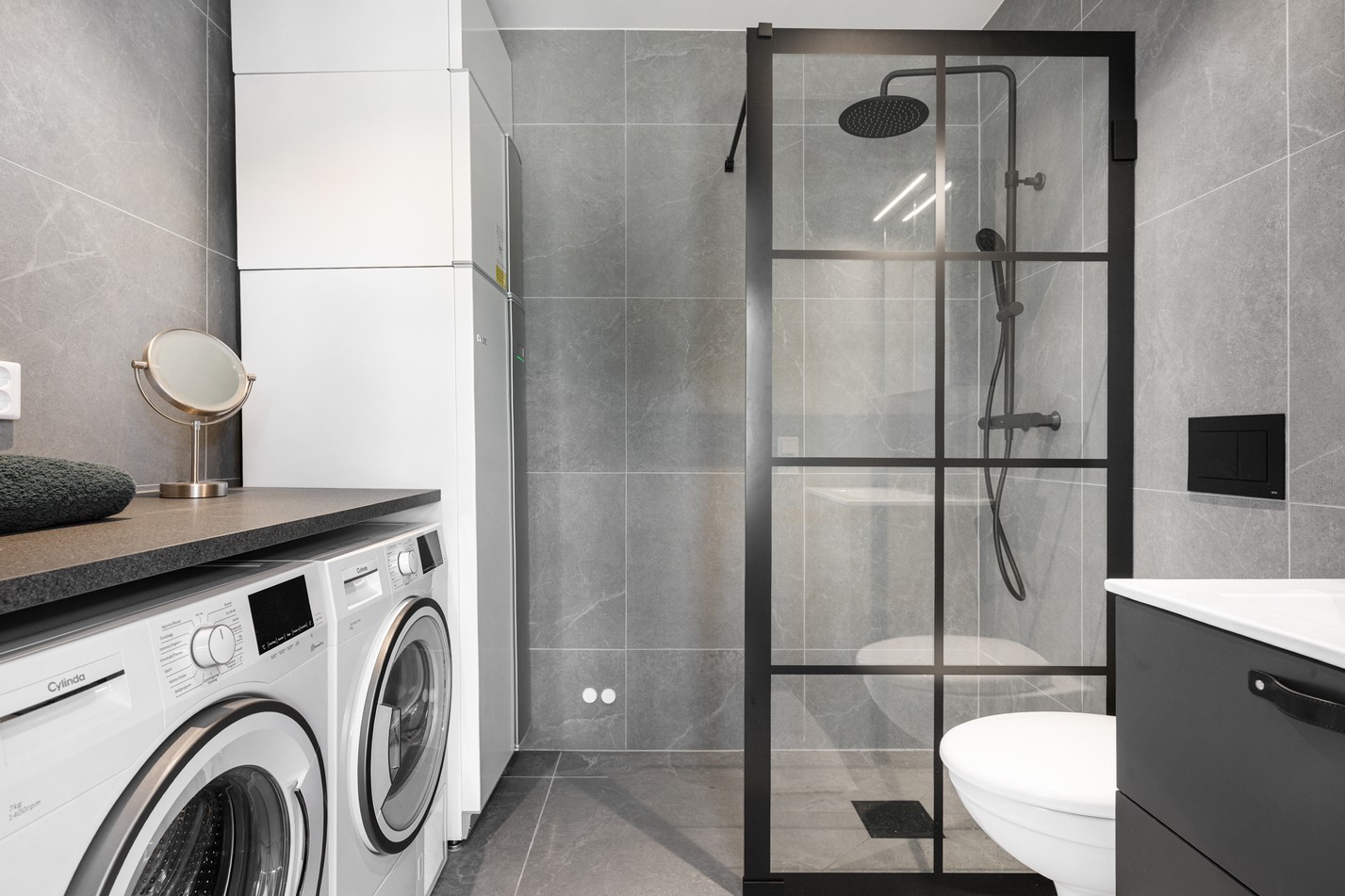 Grå klinker och grått kakel. Handfat med kommod, spegelskåp med belysning, takdusch med glasvägg med svart profil, tvättmaskin, torktumlare (Cylinda) och värmepanna. Elburen golvvärme.