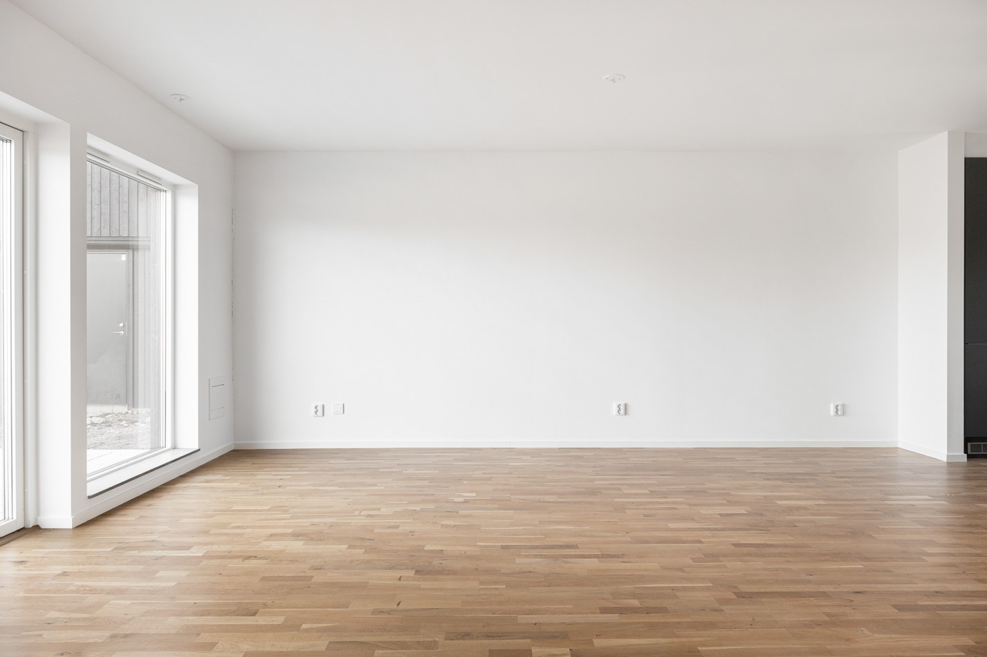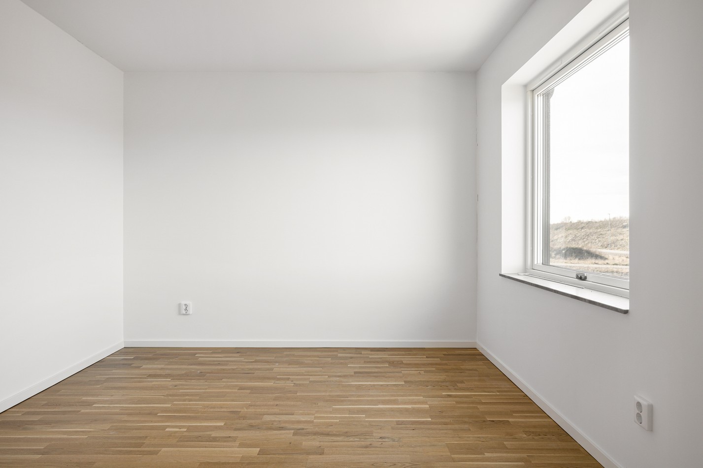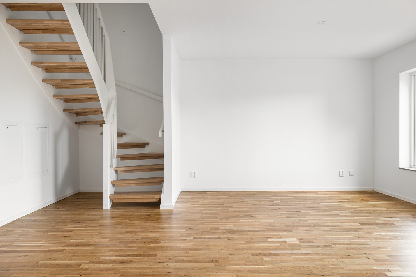 Mattlackad ekparkett och vita väggar