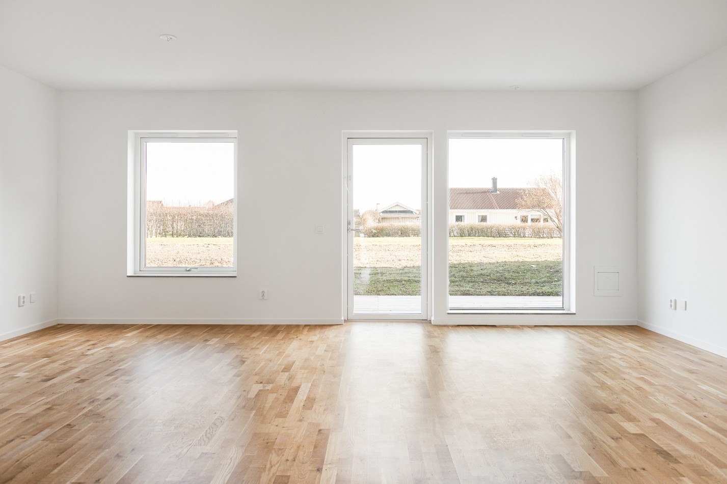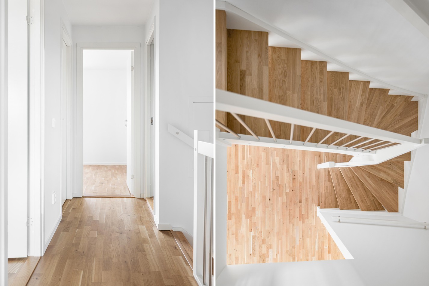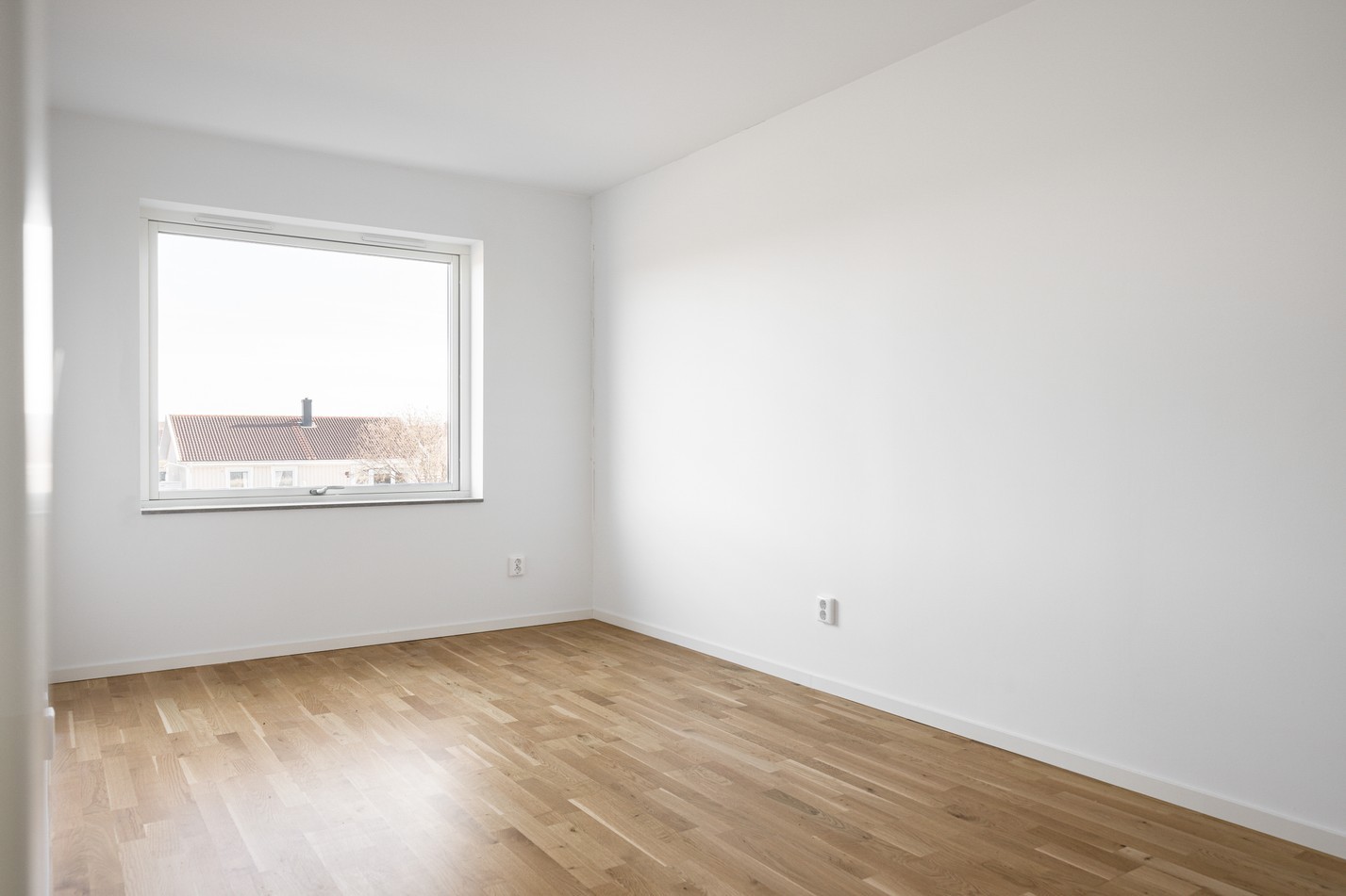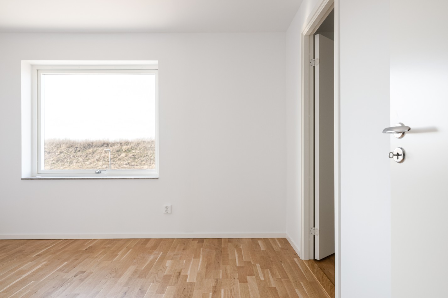 Mattlackad ekparkett och vita väggar