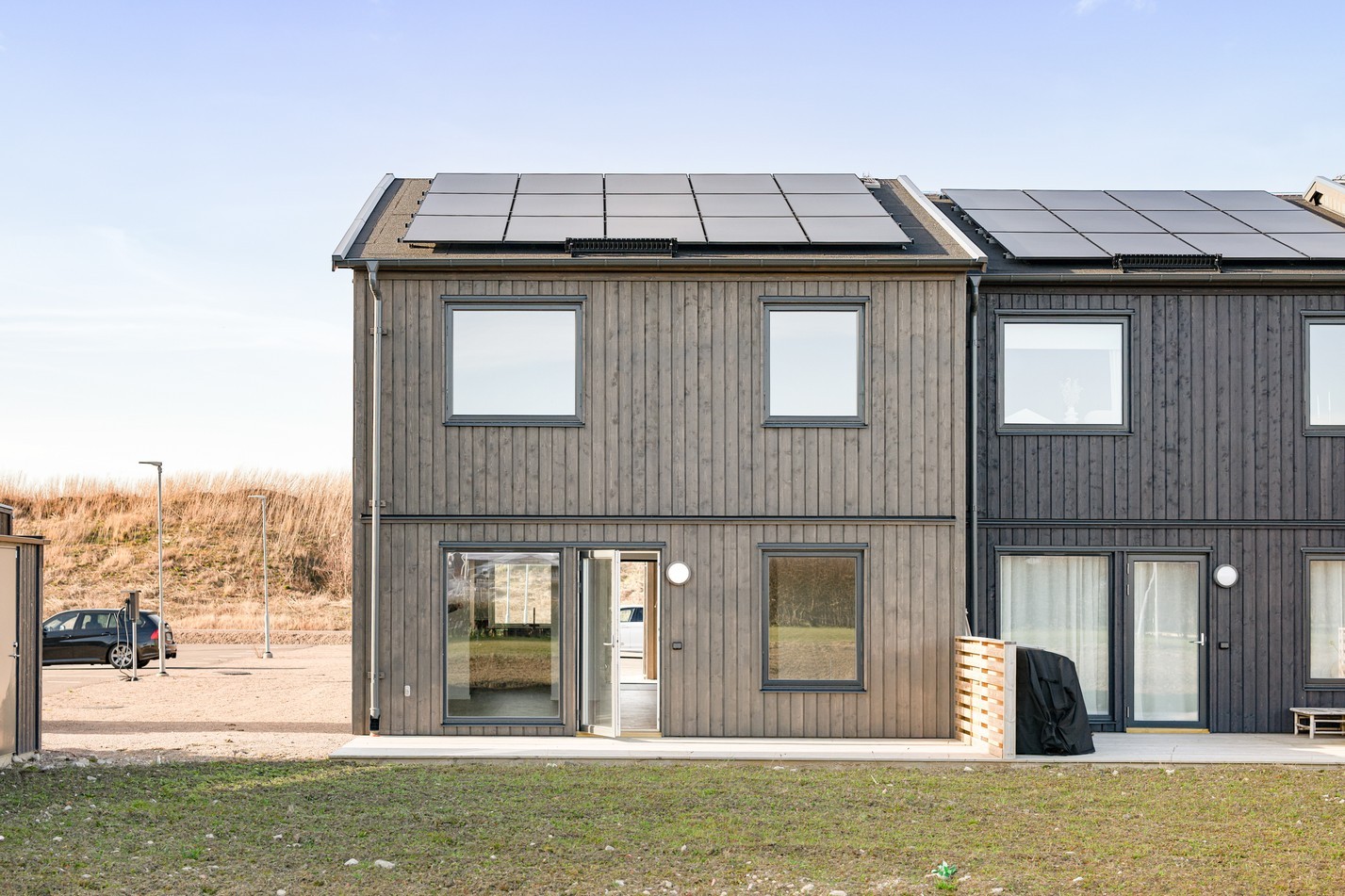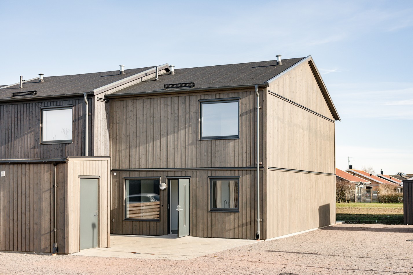 Stenlagd uteplats på husets framsida i nordost och insynsskyddat trädäck i sydväst på baksidan.