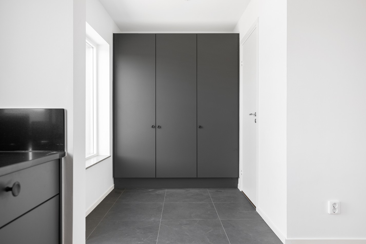 Grå klinker och vita väggar samt garderober (Marbodal).