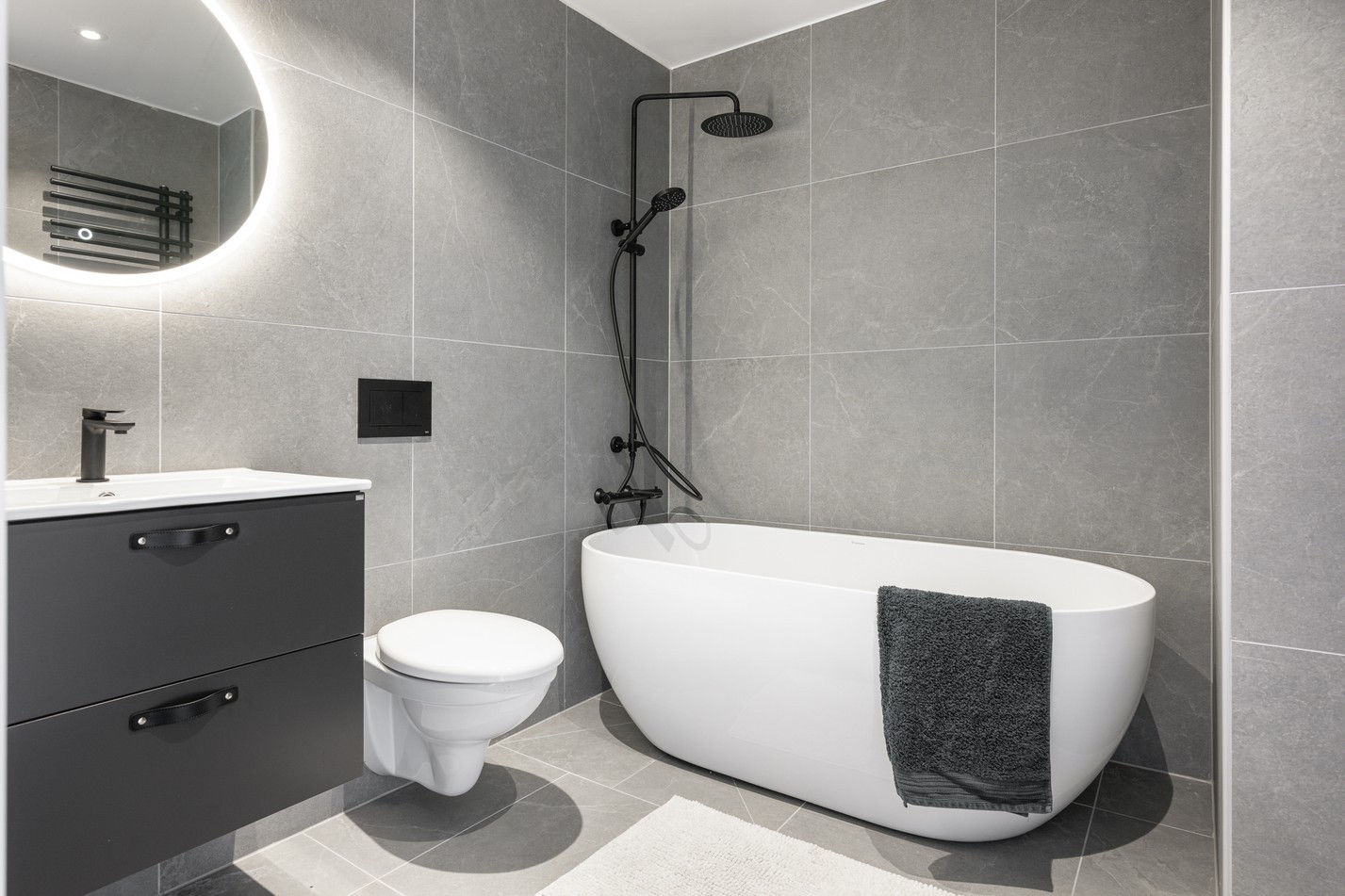 Grå klinker och grått kakel. Handfat med kommod, spegelskåp med belysning, takdusch och välvt badkar samt vägghängd WC.