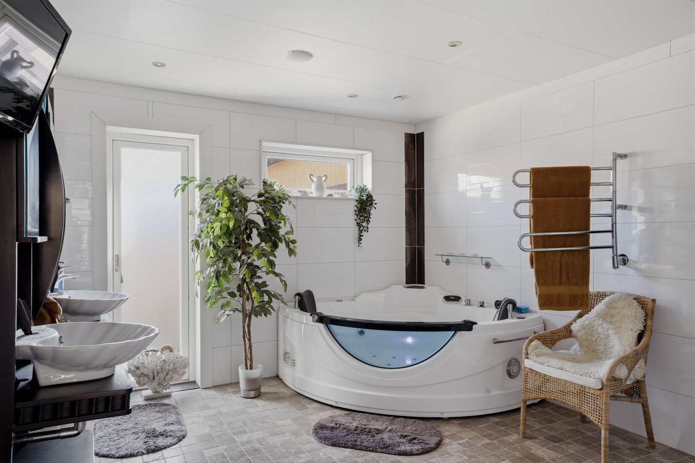 Här finns dubbla handfat med ovanpåliggande tvättställ, god förvaring, vägghängd WC samt handdukstork för extra komfort. Fönster ger fint ljusinsläpp och bidrar till en luftig känsla i rummet. Från badrummet nås även altanen via en dörr – en uppskattad detalj som ger en härlig koppling mellan inne och ute.