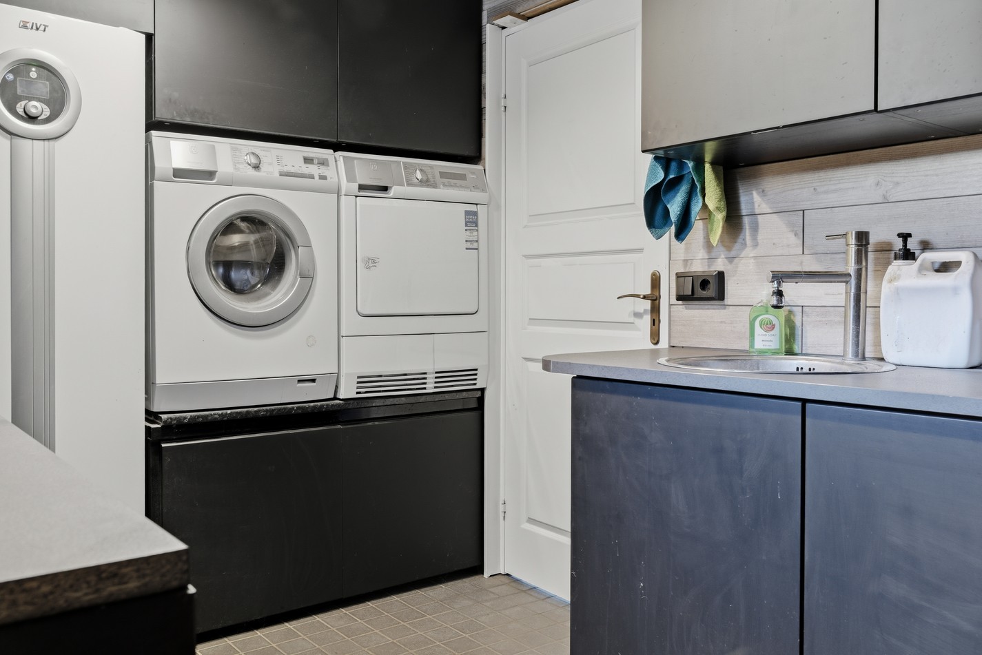 Stilren och funktionell tvättstuga med tåligt marmorgolv och generös förvaring i mörk skåpsinredning. Här finns tvättmaskin och torktumlare placerade i bekväm arbetshöjd samt arbetsbänk med praktisk tvättho som underlättar vardagens bestyr.