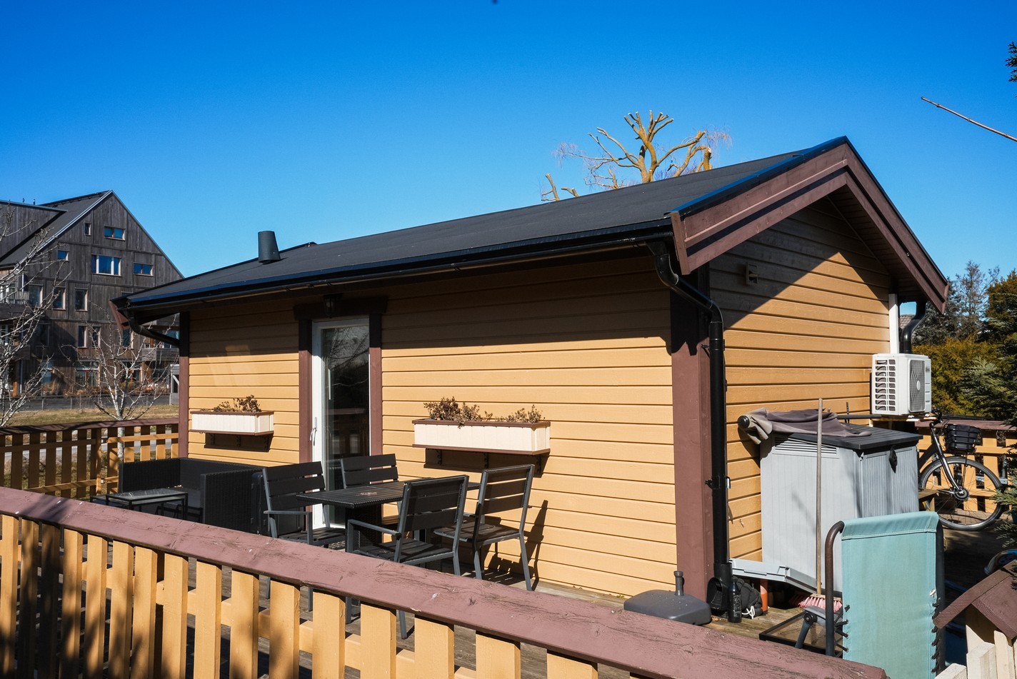 Stugan är fullt utrustad med kök innehållande ugn, induktionshäll (3 zoner), diskmaskin, mikro samt en extra bred kyl och frys. Här finns även luft/luftvärmepump med AC som ger ett behagligt inomhusklimat året runt, samt TV och surroundsystem som höjer komforten ytterligare.