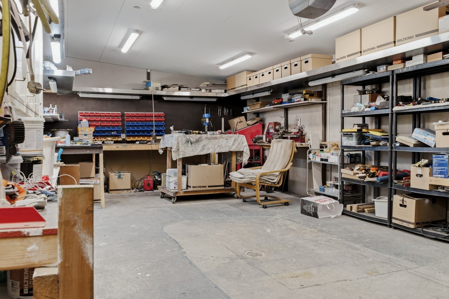 Rymligt garage med gott om plats för både bil och förvaring. Här finns generösa arbetsytor och hyllsystem som gör utrymmet perfekt för dig som gillar att meka, snickra eller behöver extra förvaringsmöjligheter.