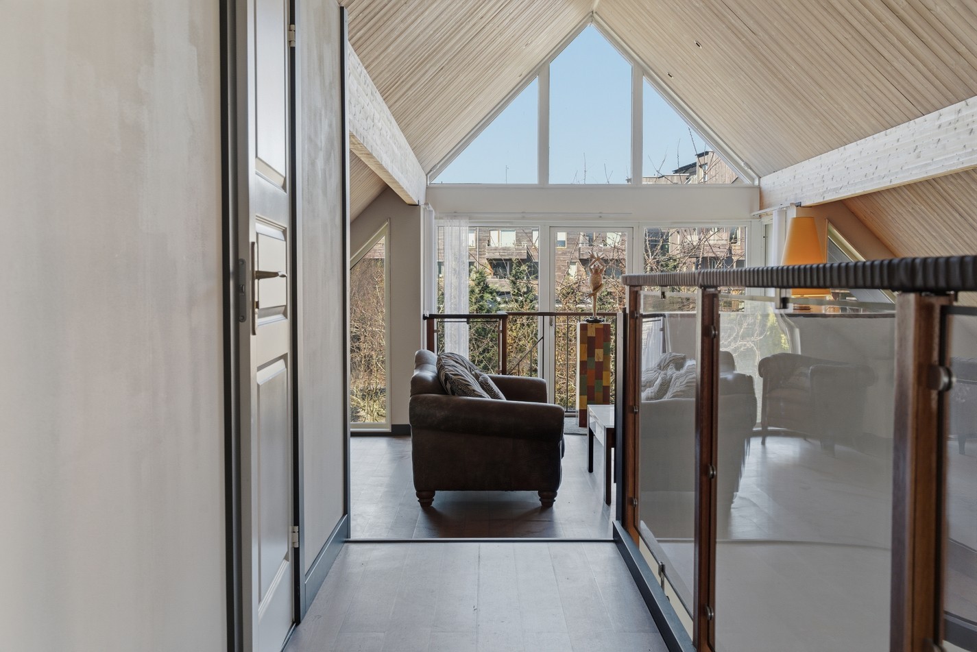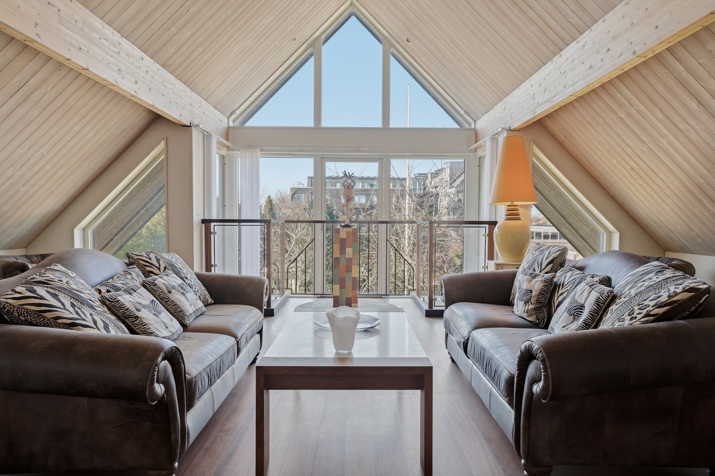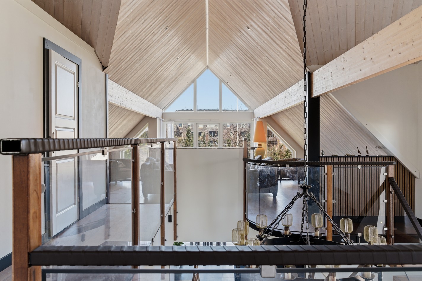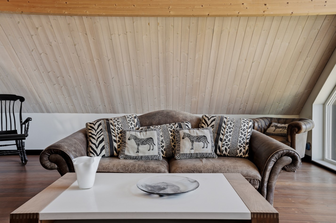 Fantastiskt sällskapsrum med imponerande rymd upp till nock och en takhöjd om ca 4 meter som verkligen ger en luftig och exklusiv känsla. Det synliga trätaket skapar en varm och ombonad atmosfär, samtidigt som det stora gavelfönstret släpper in rikligt med ljus och ger rummet en unik karaktär.