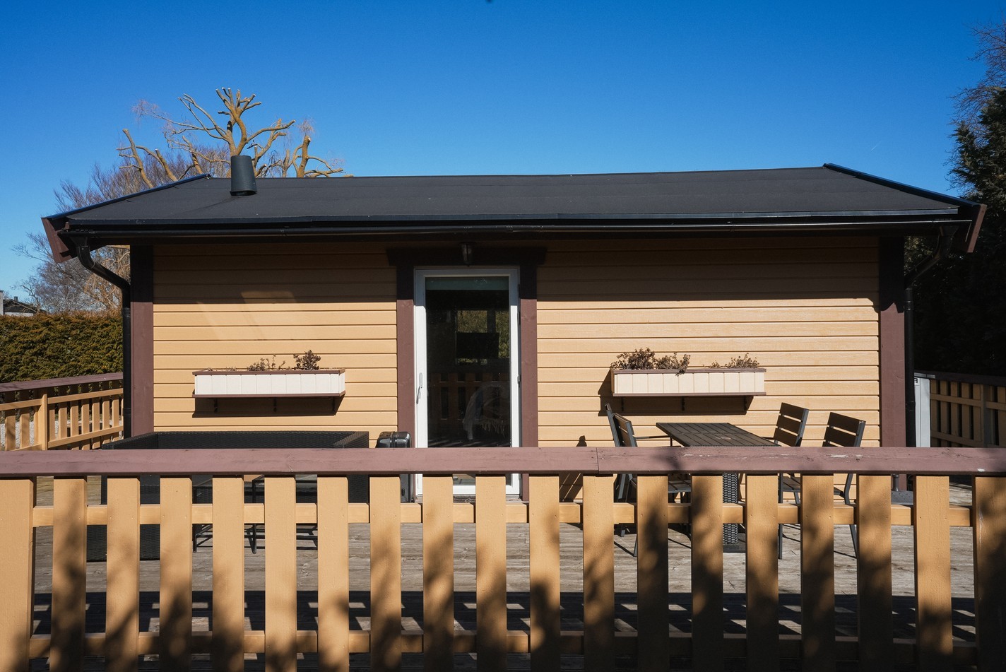 Utanför väntar en rymlig altan med staket runt om – en skyddad och trivsam uteplats med plats för utemöbler, perfekt för både avkoppling och sociala stunder.
