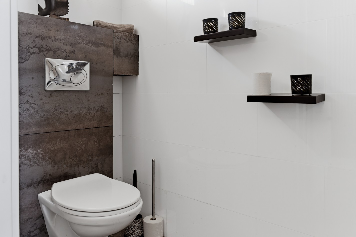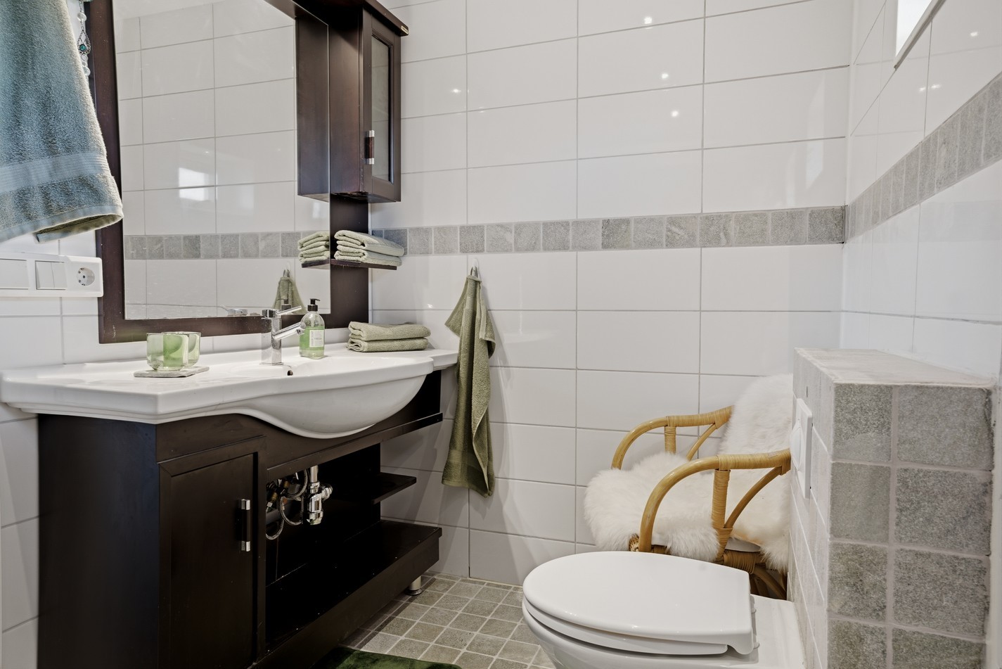 Här finns vägghängd WC, dusch samt spegel, och två öppningsbara fönster bidrar med både ljusinsläpp och god ventilation. Ett praktiskt badrum med genomtänkta materialval.