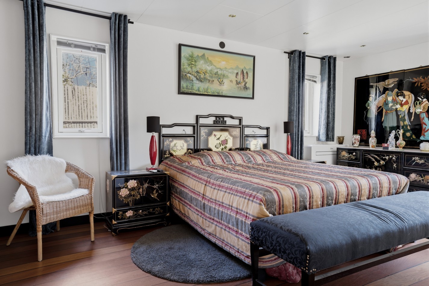 Rymligt och rogivande sovrum med vackert skeppsgolv och infällda spotlights som ger ett behagligt ljus. Här finns gott om plats för dubbelsäng med tillhörande möblemang, och rummet erbjuder även bra förvaringsmöjligheter i skjutdörrsgarderob.