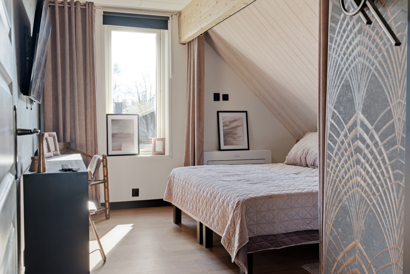 Trivsamt sovrum med snedtak som ger rummet en mysig och ombonad känsla. Fint ljusinsläpp från fönster skapar en ljus och harmonisk miljö, perfekt för vila. Här finns plats för säng och tillhörande möblemang samt möjlighet att anpassa rummet efter behov. Praktisk klädkammare i anslutning erbjuder goda förvaringsmöjligheter och bidrar till ett välorganiserat hem.