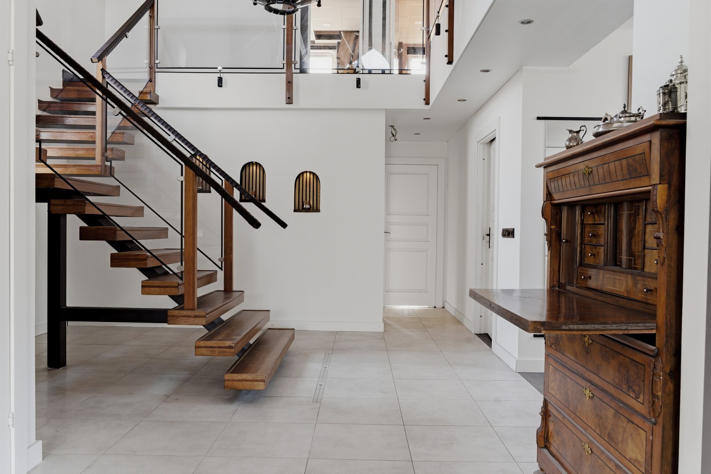 Vidare in i hallen öppnar bostaden upp sig med generös takhöjd och en elegant trappa med trästeg och stilrena räcken som blir ett vackert blickfång. Härifrån får du en fin överblick över bostadens sociala ytor, vilket förstärker känslan av rymd och sammanhang.