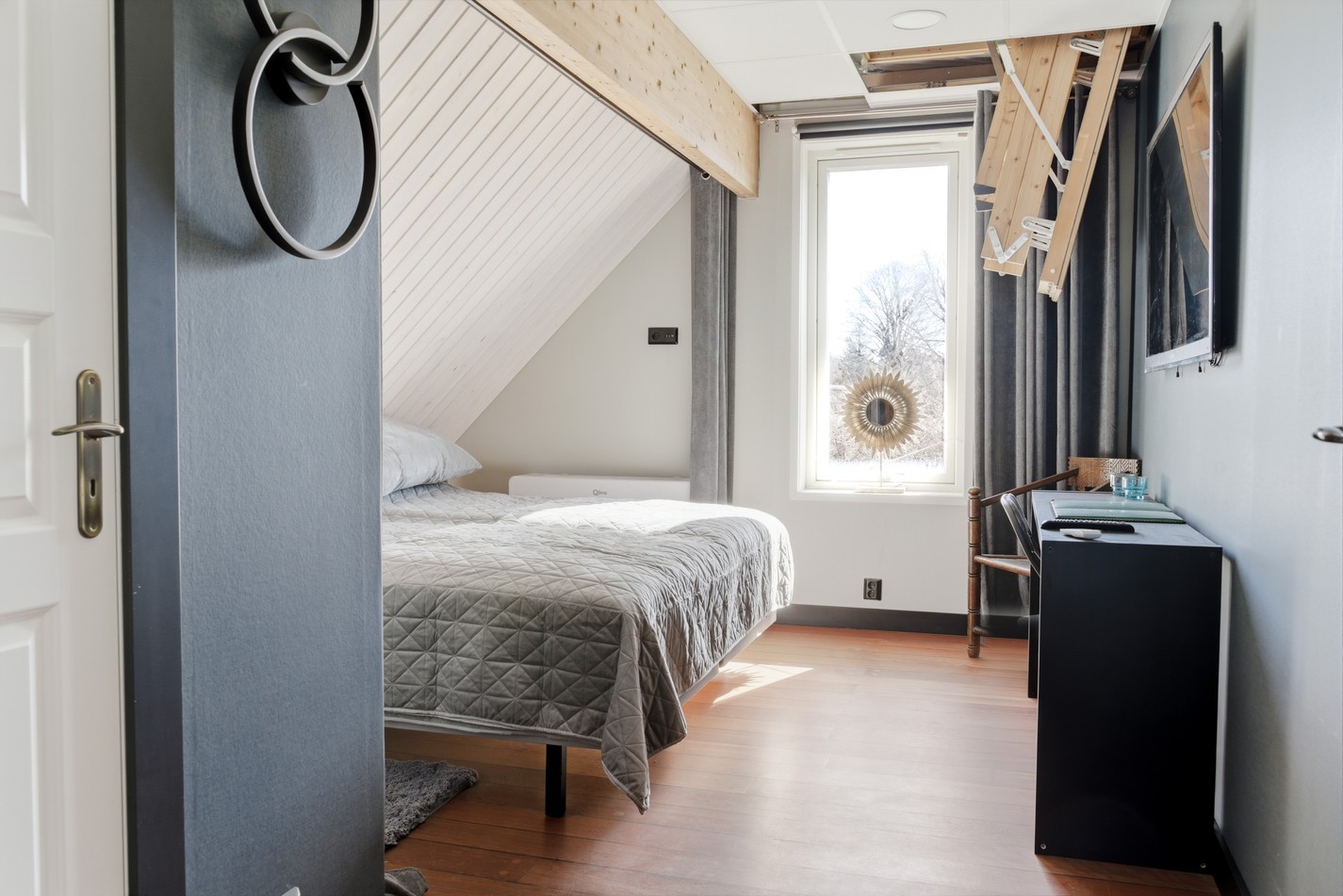 Ljust och funktionellt sovrum med snedtak som ger rummet en mysig och personlig karaktär. Fönstret släpper in fint dagsljus och skapar en trivsam miljö för både vila och arbete. Här finns plats för säng och kompletterande möblemang efter behov. I anslutning finns även en praktisk klädkammare som erbjuder goda förvaringsmöjligheter.