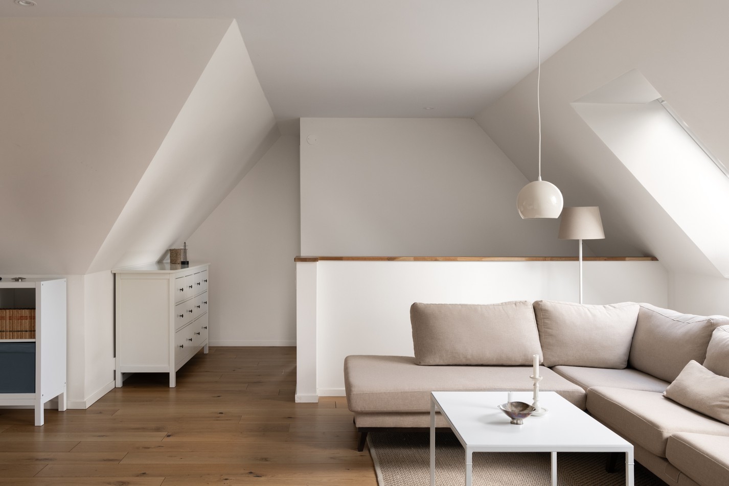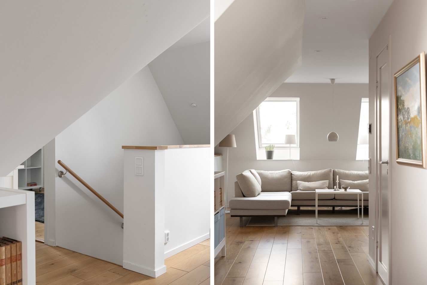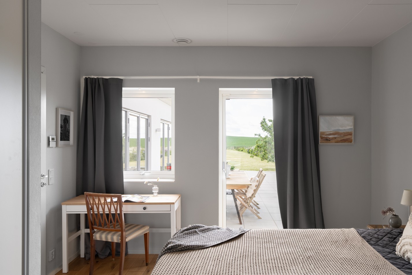 Ljust och rofyllt sovrum med harmoniska färgval och snedtak som skapar en mysig känsla. Här vaknar du upp till fantastisk utsikt genom det stora fönstret med direkt access till fransk balkong. Den genomtänkta planlösningen ger plats för både vila och förvaring, medan trägolvet ger en varm och ombonad atmosfär – en perfekt plats för återhämtning.