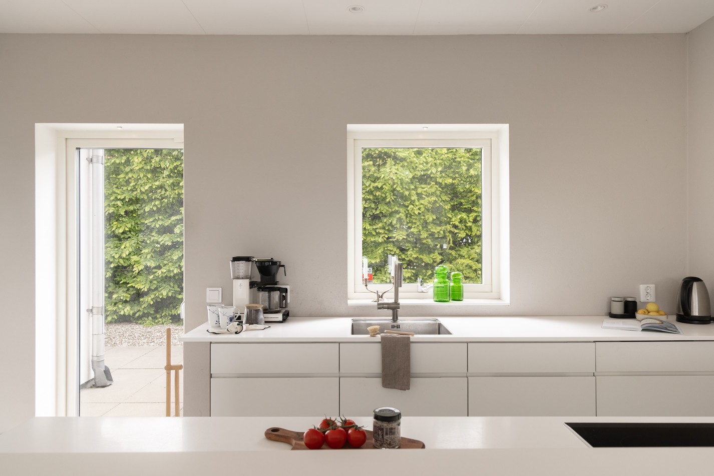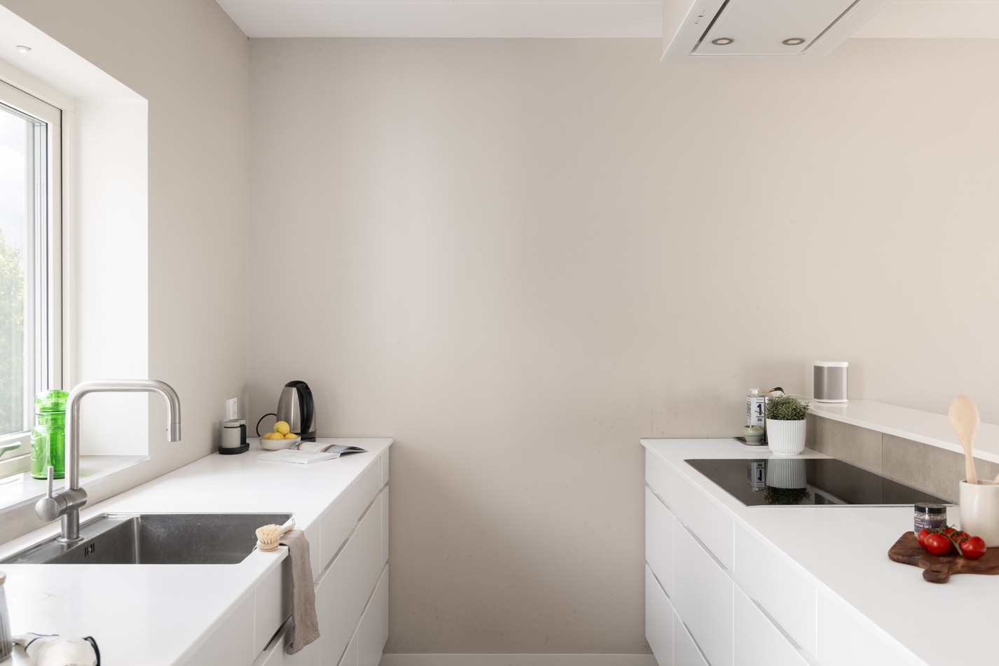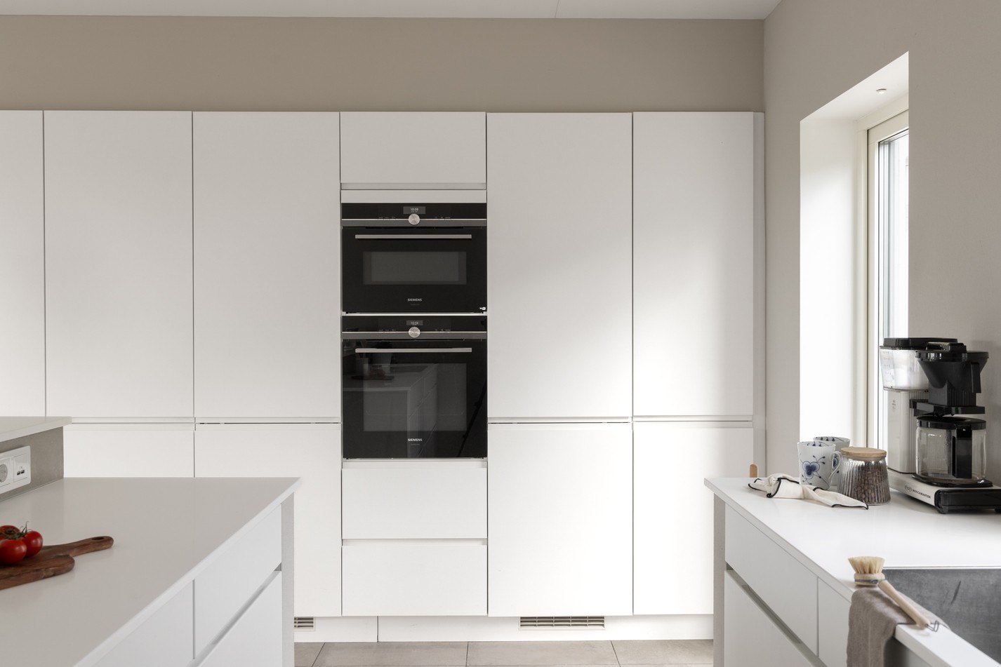 Stilrent och funktionellt kök med en öppen och social planlösning. De vita skåpsluckorna i kombination med neutrala väggar och stora golvplattor skapar en ljus och modern känsla. Den smarta bardisken binder samman kök och matplats – perfekt för både frukostkaffet och mingel med gäster. Här finns gott om arbetsyta, moderna vitvaror och ett naturligt ljusinsläpp som gör matlagningen till ett nöje.