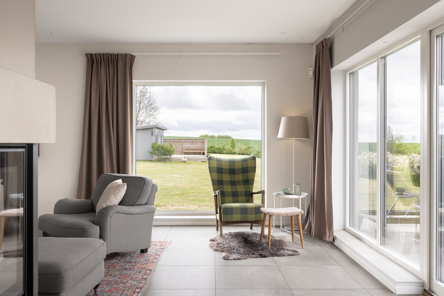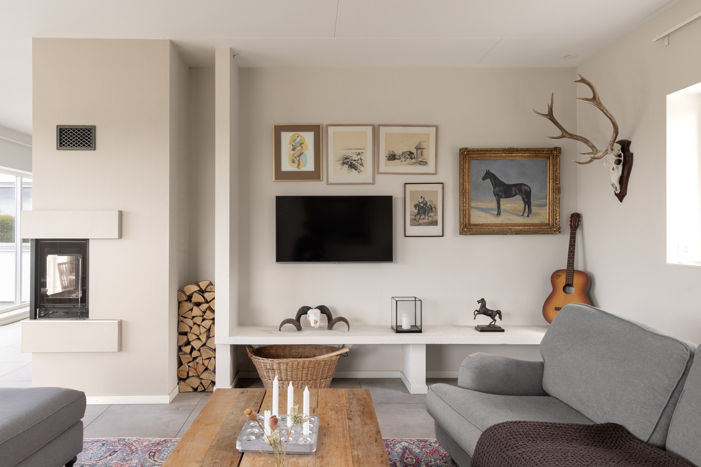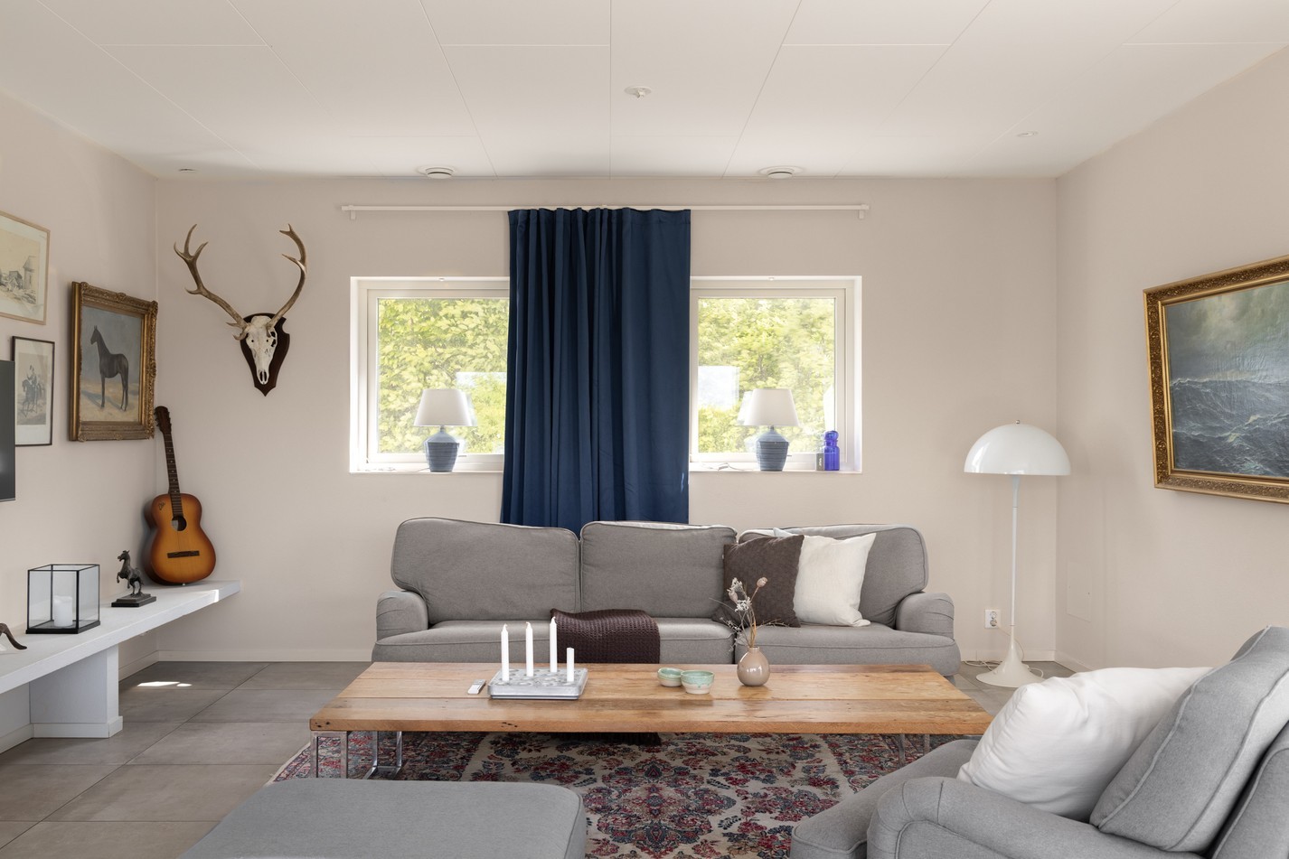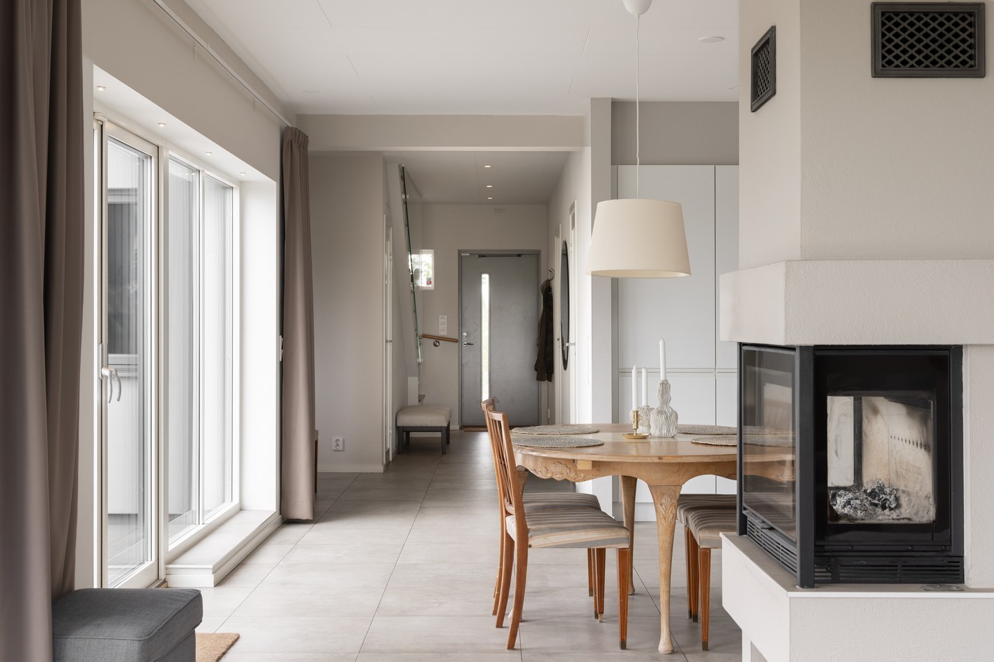 Välkommen in i ett ljust och smakfullt vardagsrum med öppen spis som hemmets hjärta. Den genomtänkta planlösningen skapar en inbjudande atmosfär där stil möter funktion. Med sobra färger, stora fönsterpartier och modern inredning är detta ett rum att trivas i – perfekt för både avkoppling och sociala stunder. Den generösa soffgruppen, det varma trägolvet och de personliga detaljerna ger hemmet karaktär och charm.
