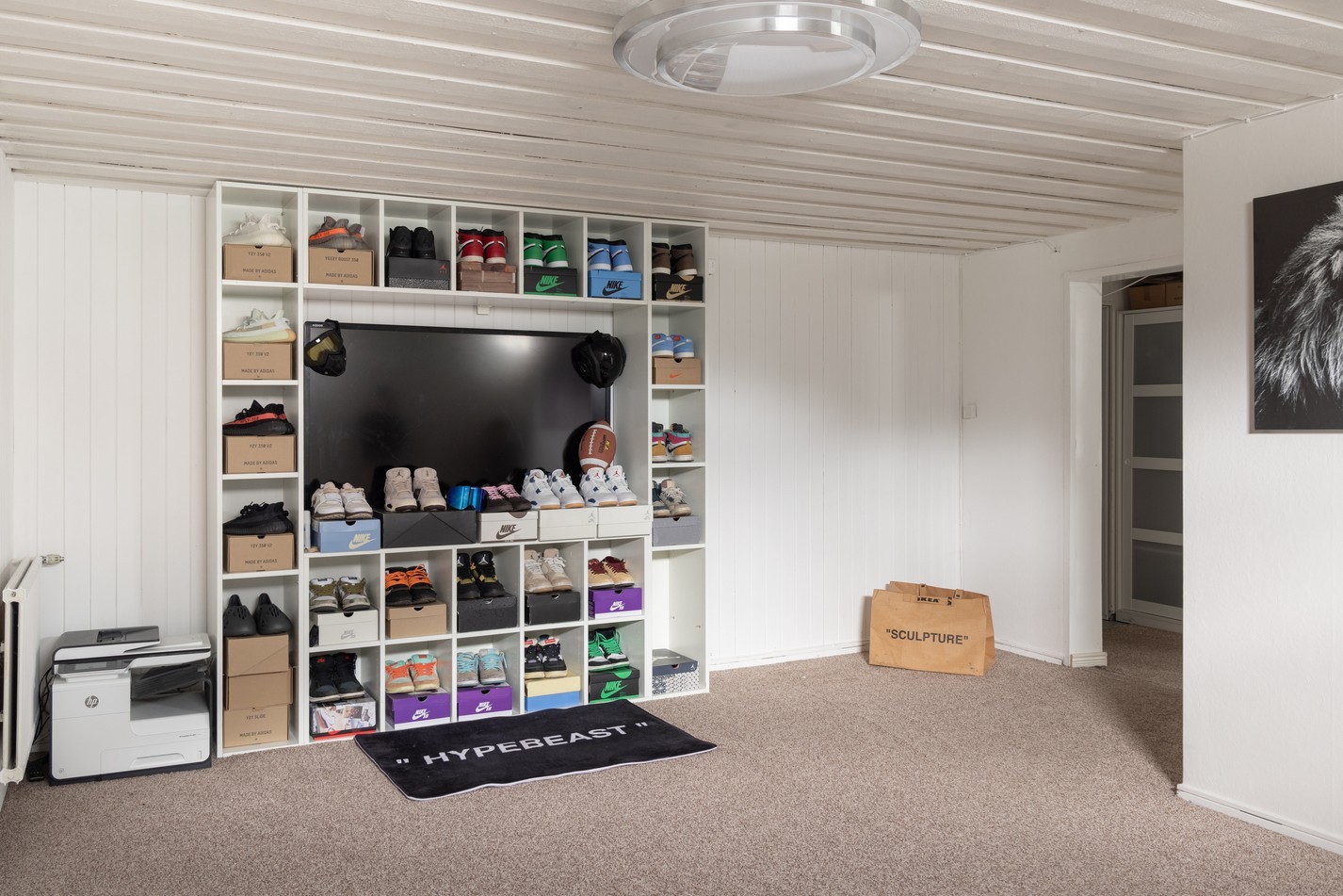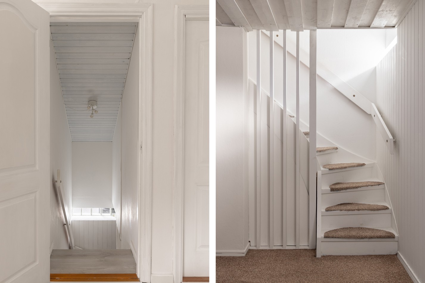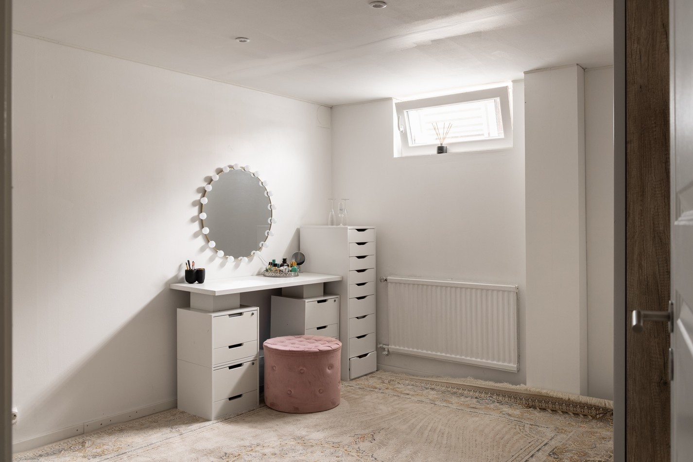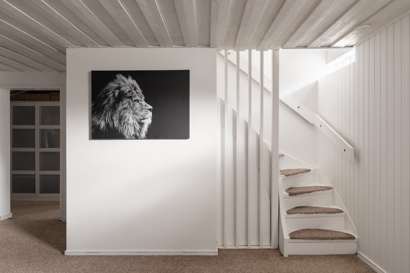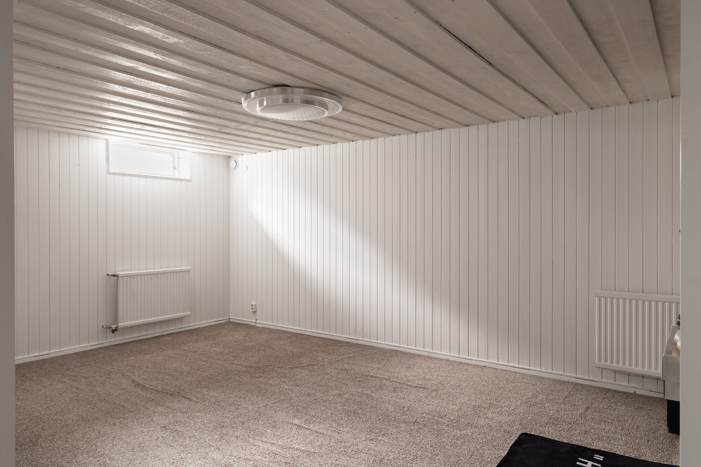 Hemmets nedre plan bjuder på ett allrum med en mysig och avskild känsla. Här finns gott om plats för både soffhörna, hobbyutrymme eller förvaring efter behov. De vitmålade väggarna och taket skapar en ljus bas som kan anpassas efter smak, och textilgolv ger en varm känsla under fötterna. Den öppna trappan binder ihop våningsplanen på ett luftigt sätt, och praktisk belysning ger bra ljus även under årets mörkare månader. Här har du möjlighet att skapa ett extra rum för avkoppling, träning eller lek – bara fantasin sätter gränserna.