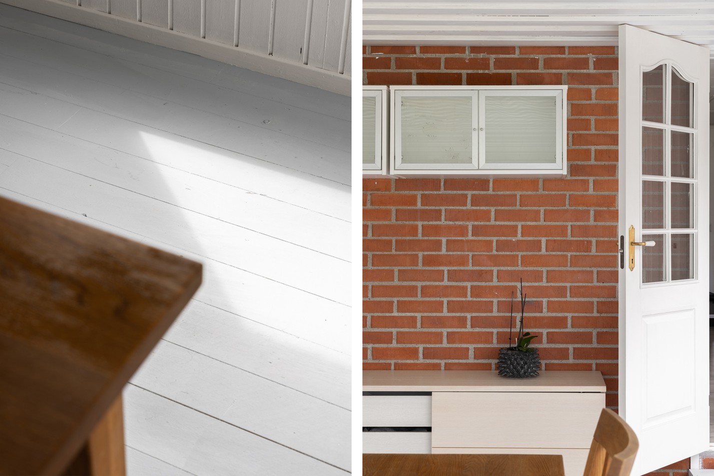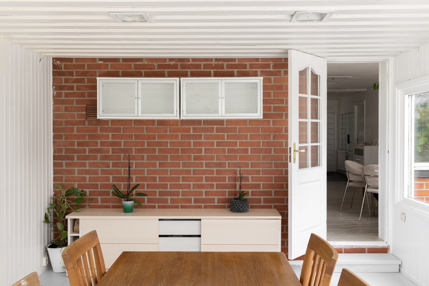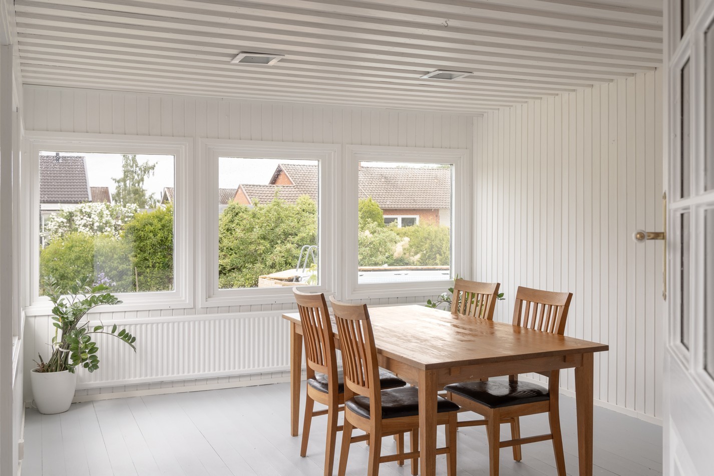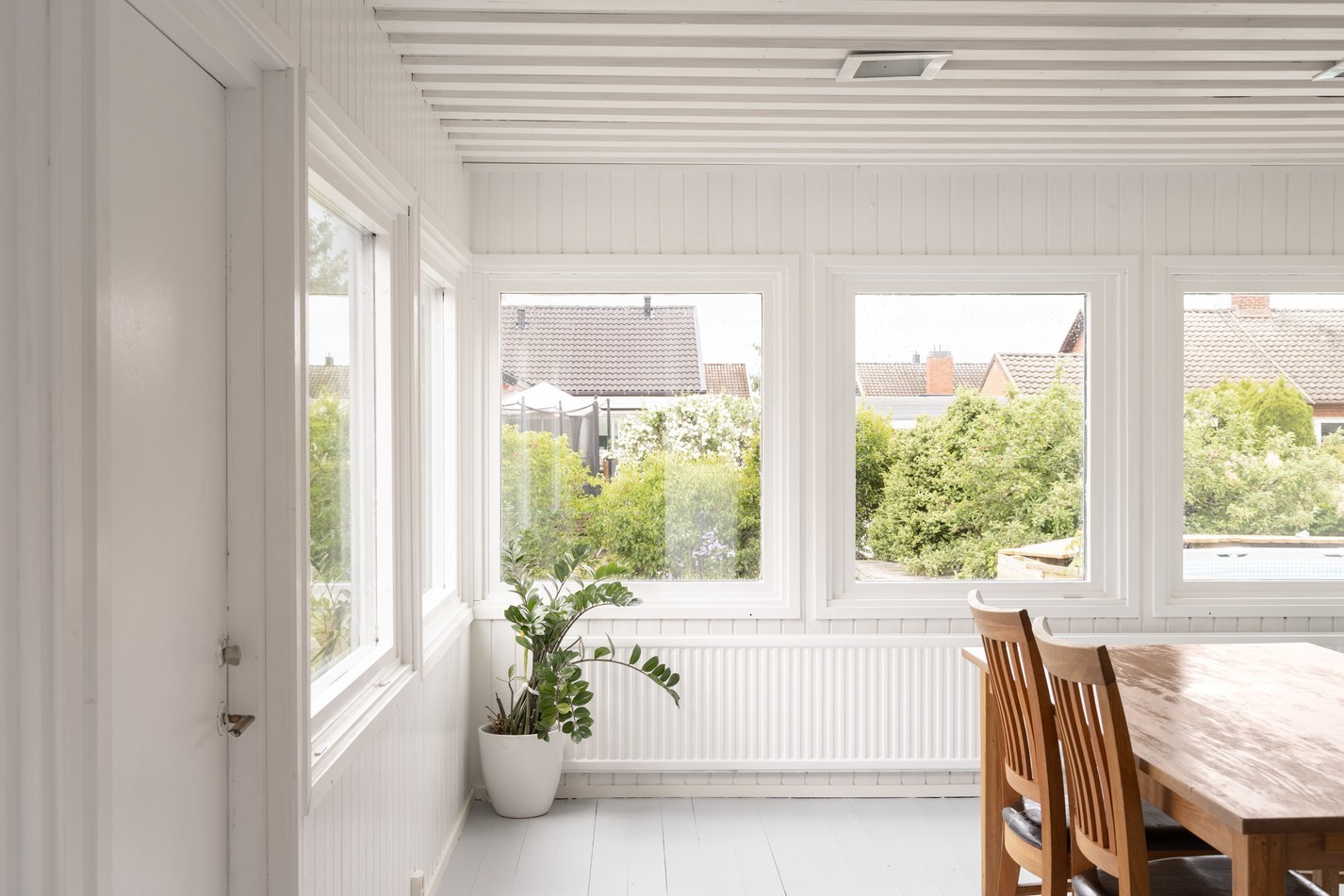 Det ljusa uterummet är en trivsam förlängning av bostaden, perfekt för att njuta av årets alla säsonger. De stora fönsterpartierna ger ett fantastiskt ljusinsläpp och bjuder på fin utsikt över den grönskande trädgården och omgivande kvarter. Här finns gott om plats för både matbord och sittgrupp, vilket skapar en naturlig plats för middagar, fikastunder eller avkoppling med en god bok. De vitmålade väggarna och det stilrena golvet ger en neutral bas som enkelt kan anpassas efter din egen stil och smak.