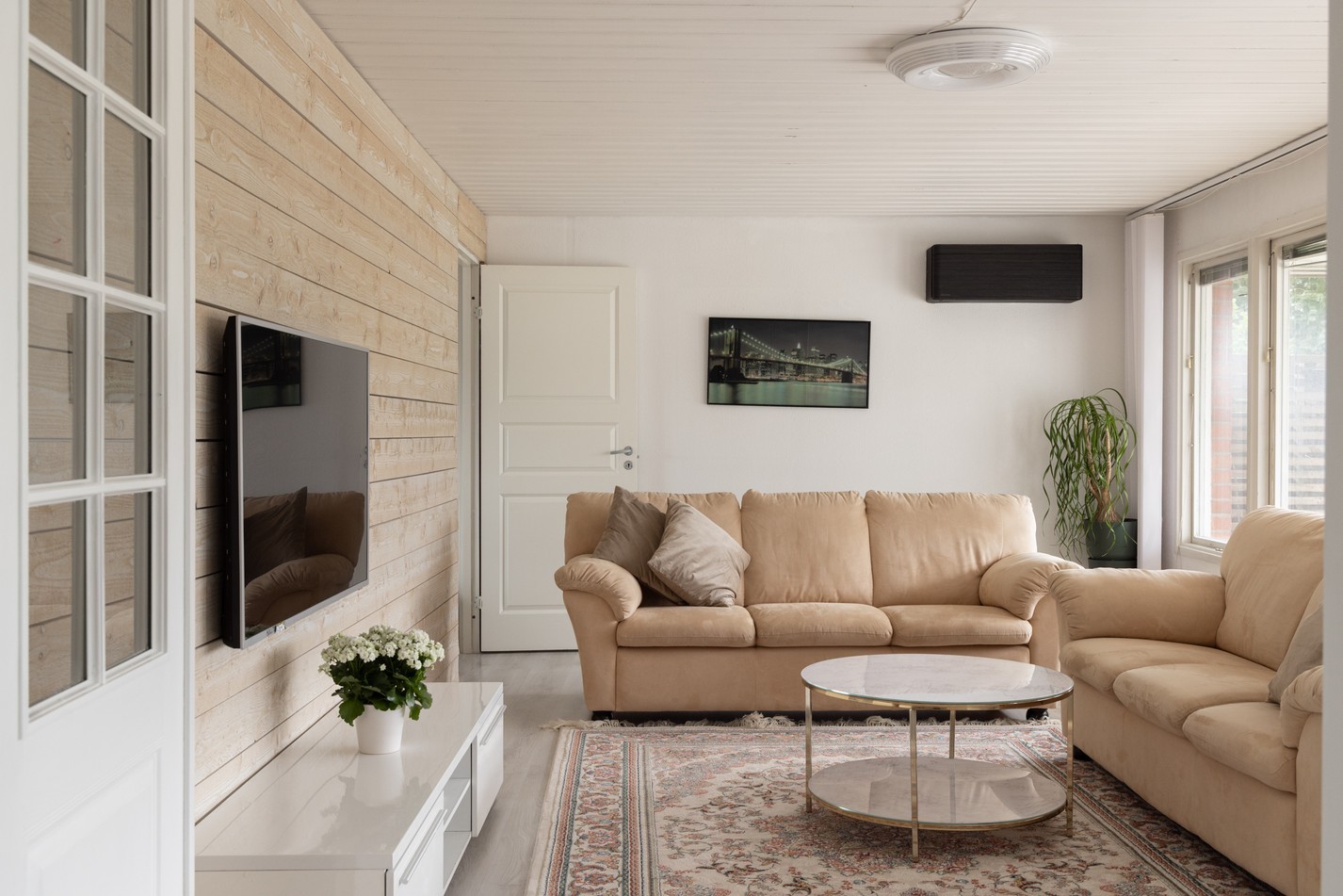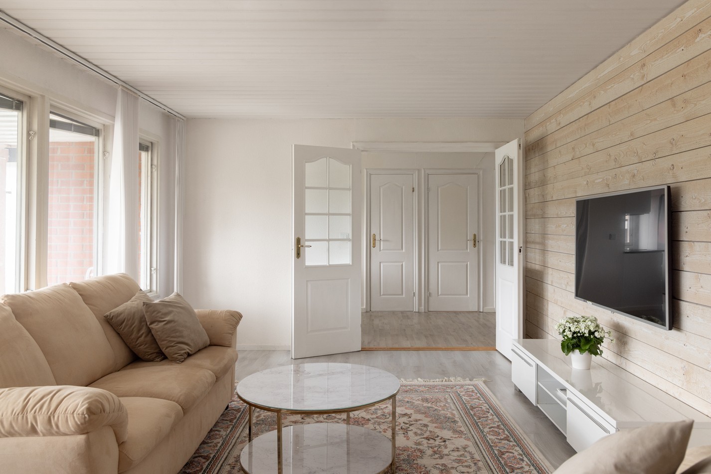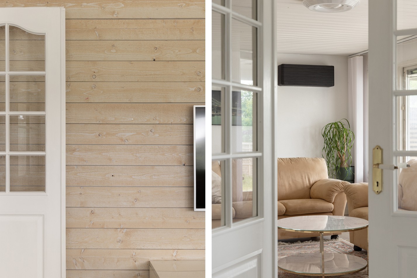 Det luftiga allrummet bjuder på härliga ytor för både avkoppling och social samvaro. Rummet har ett fint ljusinsläpp tack vare den generösa fönsterväggen som vetter mot uteplatsen, vilket skapar en luftig och trivsam känsla. Den vitmålade träpanelen i taket och väggarna ger en ljus och fräsch bas, medan den liggande träpanelen på fondväggen tillför karaktär och värme. Här finns gott om plats för soffgrupp, tv-möbel och extra förvaring om så önskas. Rummet har potential att utvecklas ytterligare efter egna önskemål – varför inte måla om, byta golv eller addera personliga detaljer för att skapa ett rum helt i din stil? Här kan du enkelt skapa en modern lounge eller en mer klassisk vardagsrumsmiljö – möjligheterna är många.