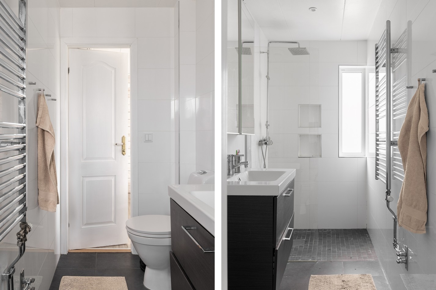 Stilrent badrum med modern känsla och bra funktionalitet. Väggarna är helkaklade i vitt som skapar en fräsch och tidlös atmosfär. Det generösa duschutrymmet är utrustat med både tak- och handdusch samt smarta nischer för praktisk förvaring av hygienprodukter. Här finns även en vägghängd handdukstork som skänker extra komfort. Det svarta golvklinkret bryter snyggt av mot det ljusa och ger en ombonad känsla. Badrummet är renoverat i en stil som håller över tid, men lämnar samtidigt utrymme för dig som vill sätta din egen prägel med färger eller detaljer.