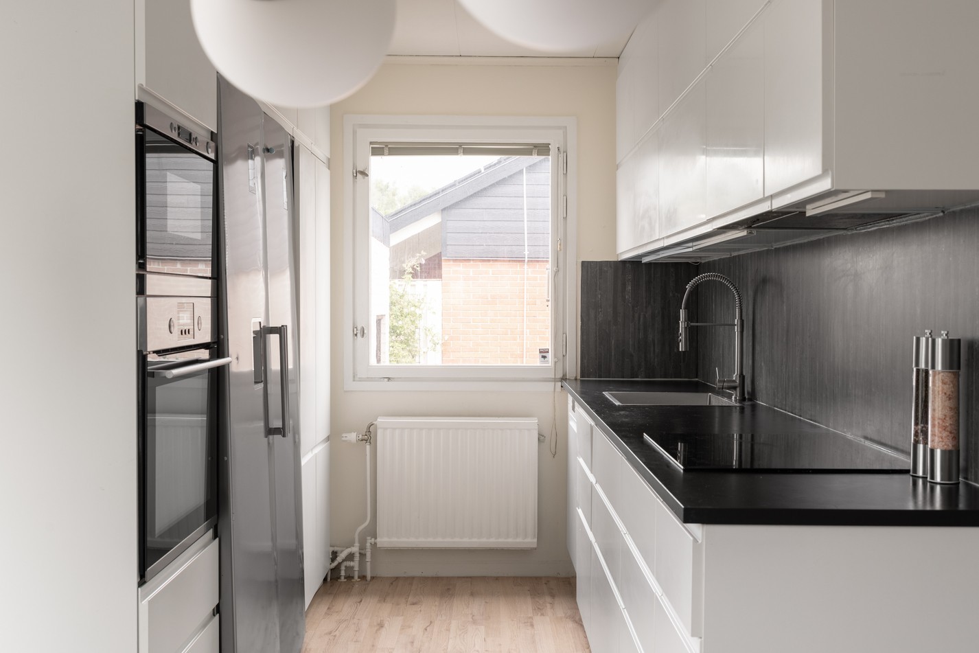 Här möts du av ett stilrent och välplanerat kök med moderna materialval och gott om arbetsyta. De vita skåpsluckorna i kombination med den mörka bänkskivan skapar en sober kontrast och en tidlös känsla. Den maskinella utrustningen är placerad på ett praktiskt sätt, vilket underlättar vardagens matlagning. Det stora fönstret ger ett härligt ljusinsläpp och en fin vy över omgivningen medan du lagar mat eller njuter av morgonkaffet. Den intilliggande matplatsen ger utrymme för både vardagsmiddagar och trevliga middagsbjudningar. För dig som önskar sätta din egen prägel finns här fina möjligheter att exempelvis måla om, byta beslag eller komplettera med ytterligare förvaringslösningar – köket har alla förutsättningar för att bli en naturlig samlingspunkt i hemmet!
