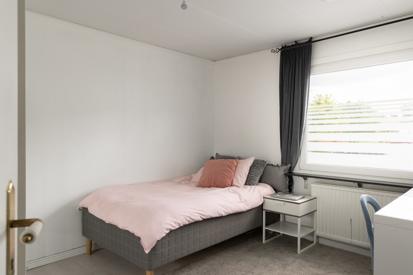 Detta rofyllda sovrum erbjuder en neutral bas med ljusa väggar och generöst ljusinsläpp från det stora fönstret. Här finns gott om plats för säng, förvaring och skrivbord eller annan möblering som passar dina behov. Rummet är lättmöblerat och ger en perfekt möjlighet för dig att sätta din egen prägel – kanske med en fondvägg, nya textilier eller andra personliga detaljer.