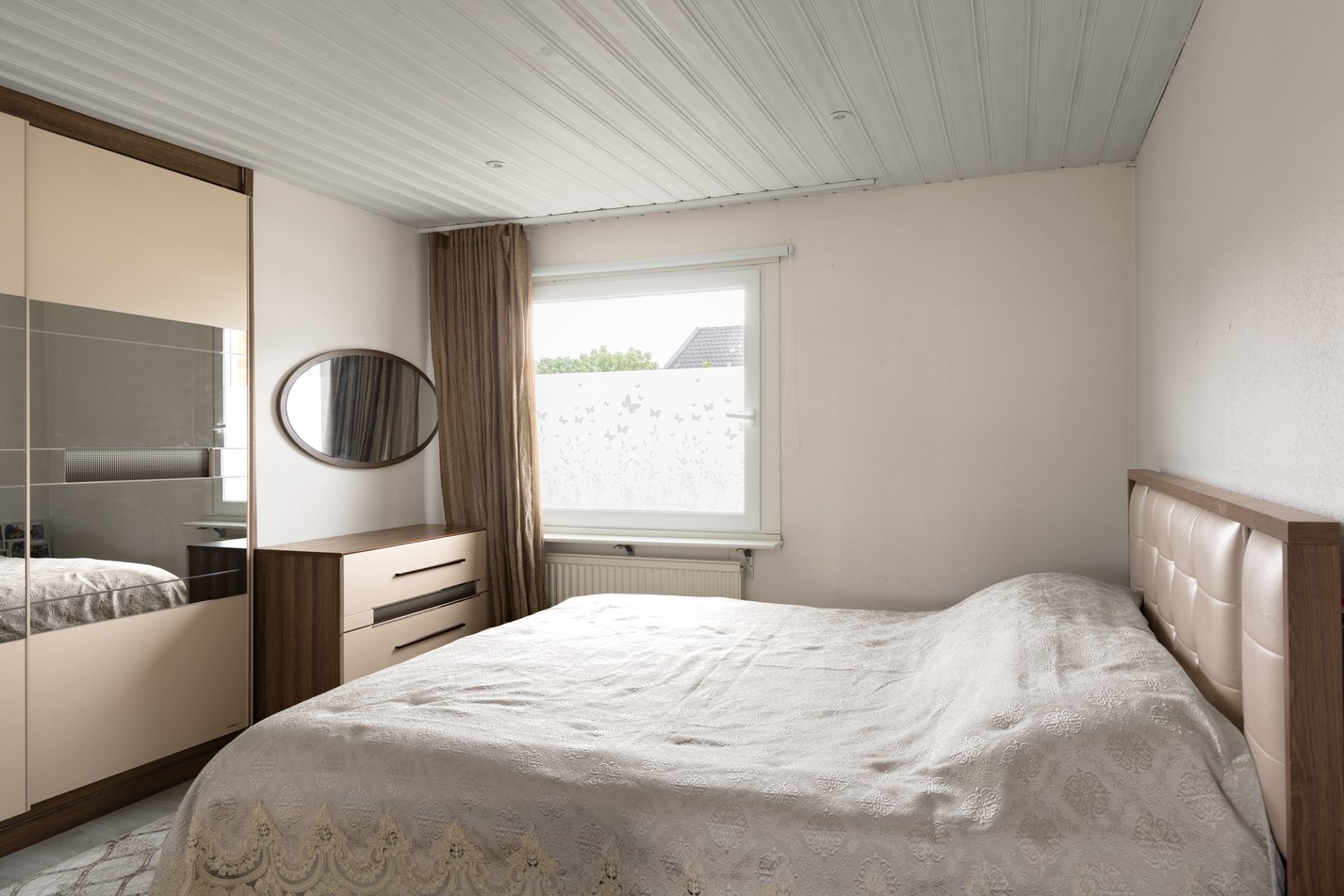 Rymligt sovrum med plats för dubbelsäng, förvaring och övrig möblering. Här finns en generös garderobslösning med spegelfront som rymmer gott om kläder och textilier. Det stora fönstret ger ett behagligt ljusinsläpp samtidigt som frostad film ger insynsskydd. Ett rum med fina möjligheter att sätta sin egen prägel med färg och textil för att skapa en varm och rofylld atmosfär.