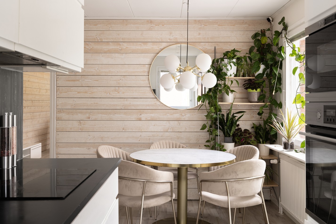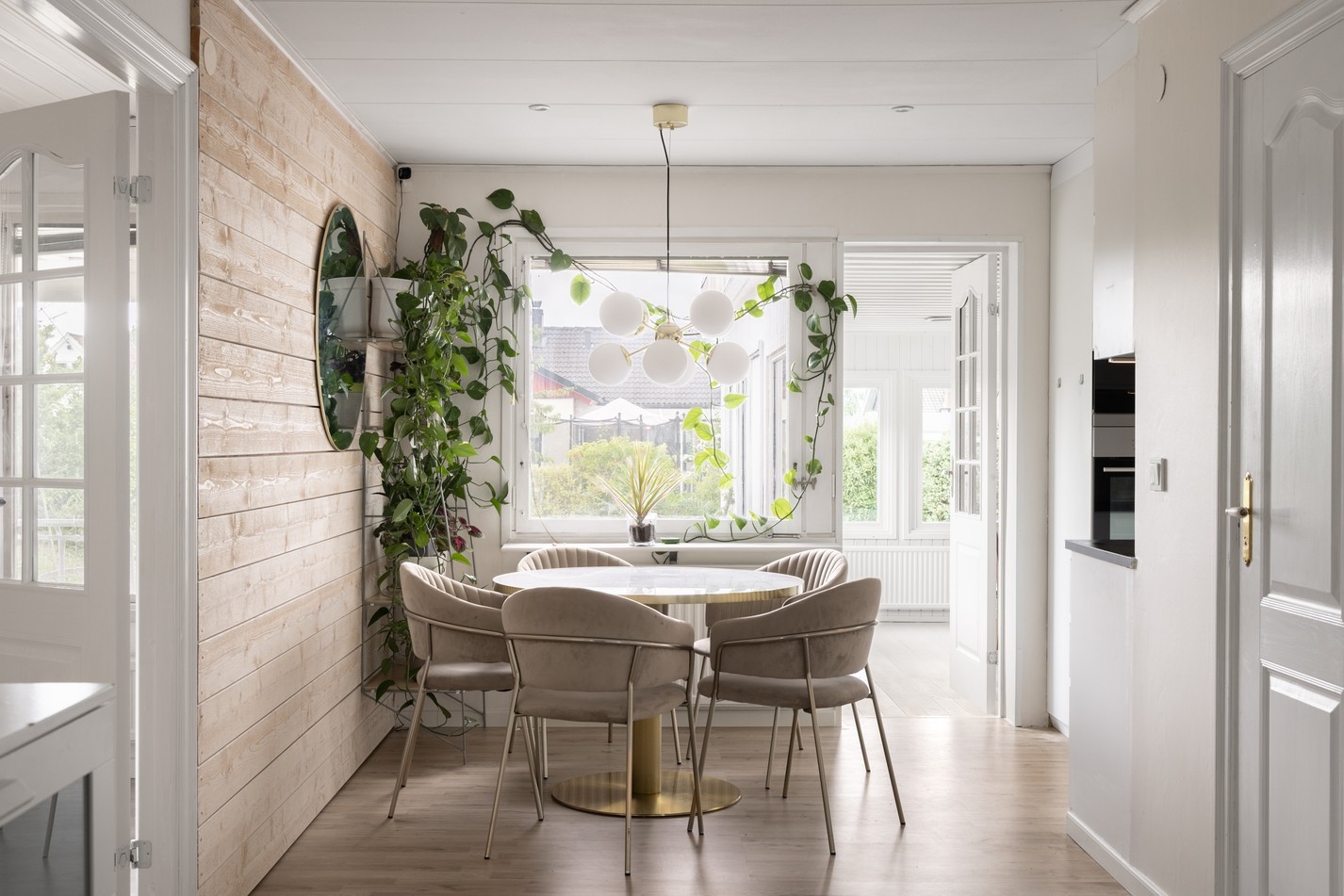 Den här trivsamma matplatsen bjuder på en härlig grund att utgå ifrån när du vill skapa ditt personliga drömkök. Den charmiga träpanelen på väggen ger rummet en varm och naturlig känsla som enkelt kan förstärkas eller moderniseras efter smak. Här finns plats för ett rejält matbord där familj och vänner kan samlas för både vardagsmiddagar och festliga tillfällen. De stora fönstren skapar ett fint ljusinsläpp och ger en luftig atmosfär med utsikt mot trädgården. Matplatsen ligger i anslutning till köket, vilket gör det praktiskt och lätt att umgås medan maten tillagas. Perfekt för dig som vill sätta din egen prägel på en yta med stor potential!