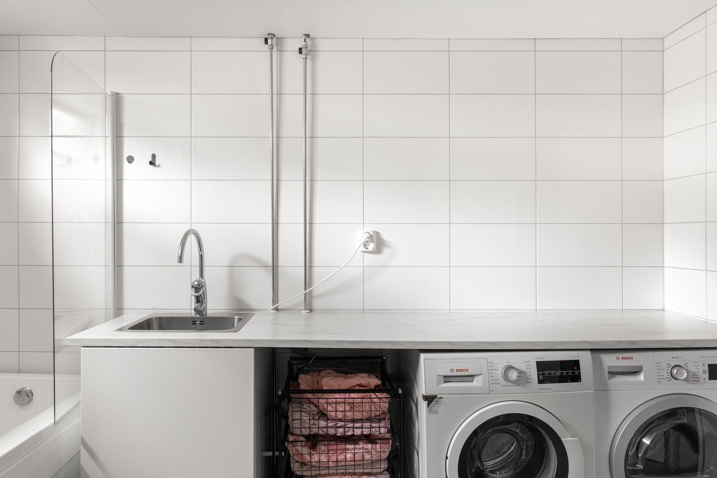 Ljus och funktionell tvättstuga med generösa arbetsytor och praktisk förvaring. Här finns både tvättmaskin och torktumlare från Bosch samt en rejäl arbetsbänk som underlättar tvätt- och vikrutinerna. Tidlöst vitt kakel ger ett fräscht intryck och skapar en trivsam miljö. Här finns också en stor frysbox och ett badkar – perfekt för både tvätt och enklare badmöjligheter. Ett välplanerat utrymme som kombinerar nytta och komfort på bästa sätt.