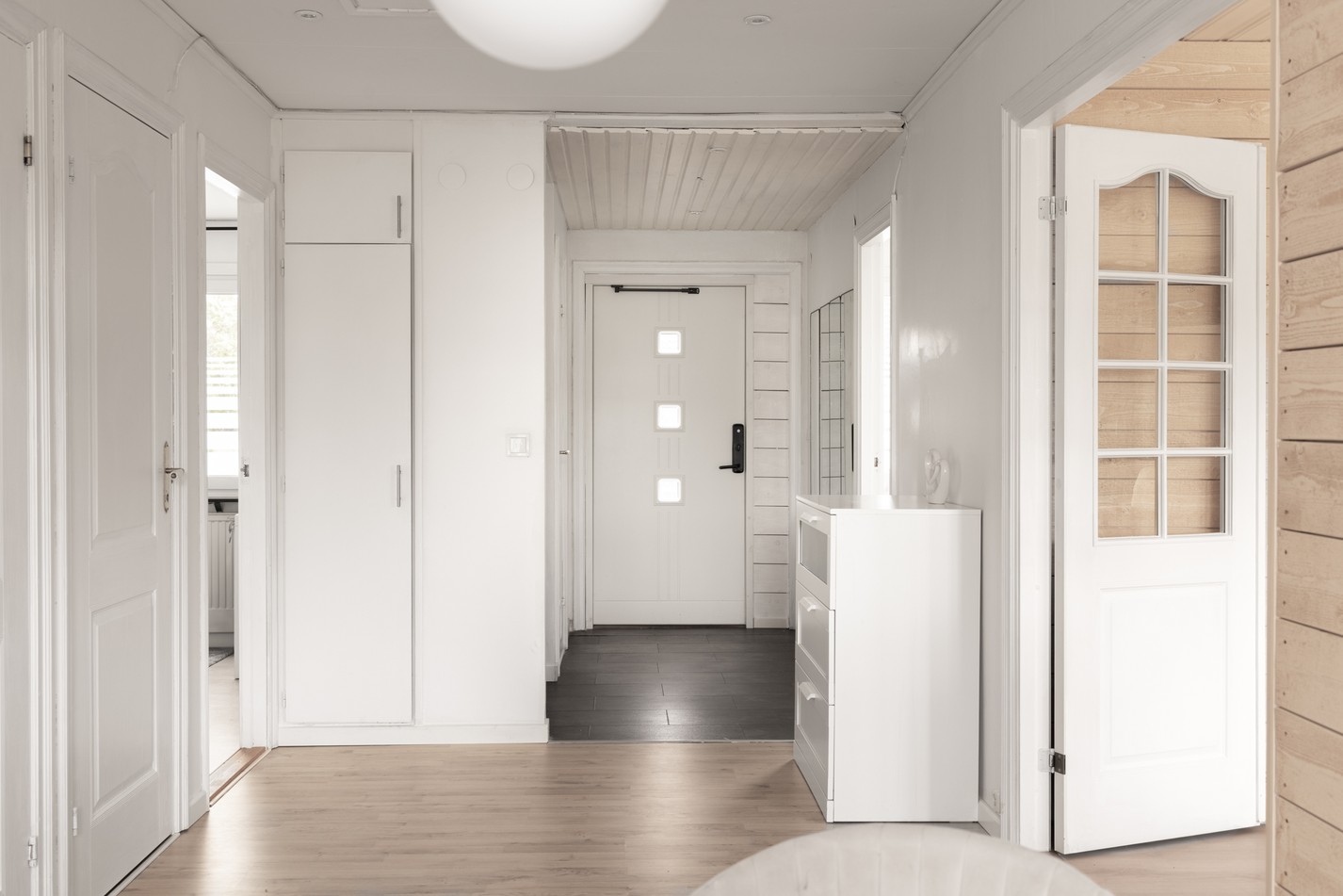 Välkommen in i en ljus och rymlig hall som ger ett trevligt första intryck av bostaden. Här finns gott om plats för att hänga av ytterkläder och förvara skor i både garderober och byrå. De neutrala ytskikten och det fina ljusinsläppet skapar en perfekt grund för dig som vill sätta din egen stil – med rätt detaljer kan hallen enkelt förvandlas till en inbjudande entré som speglar din personliga smak.